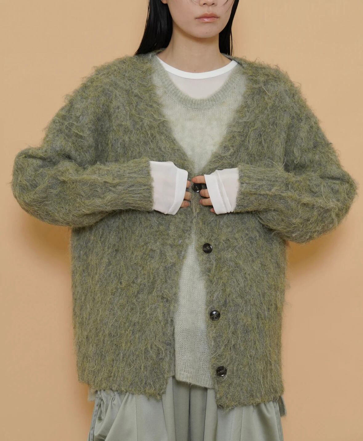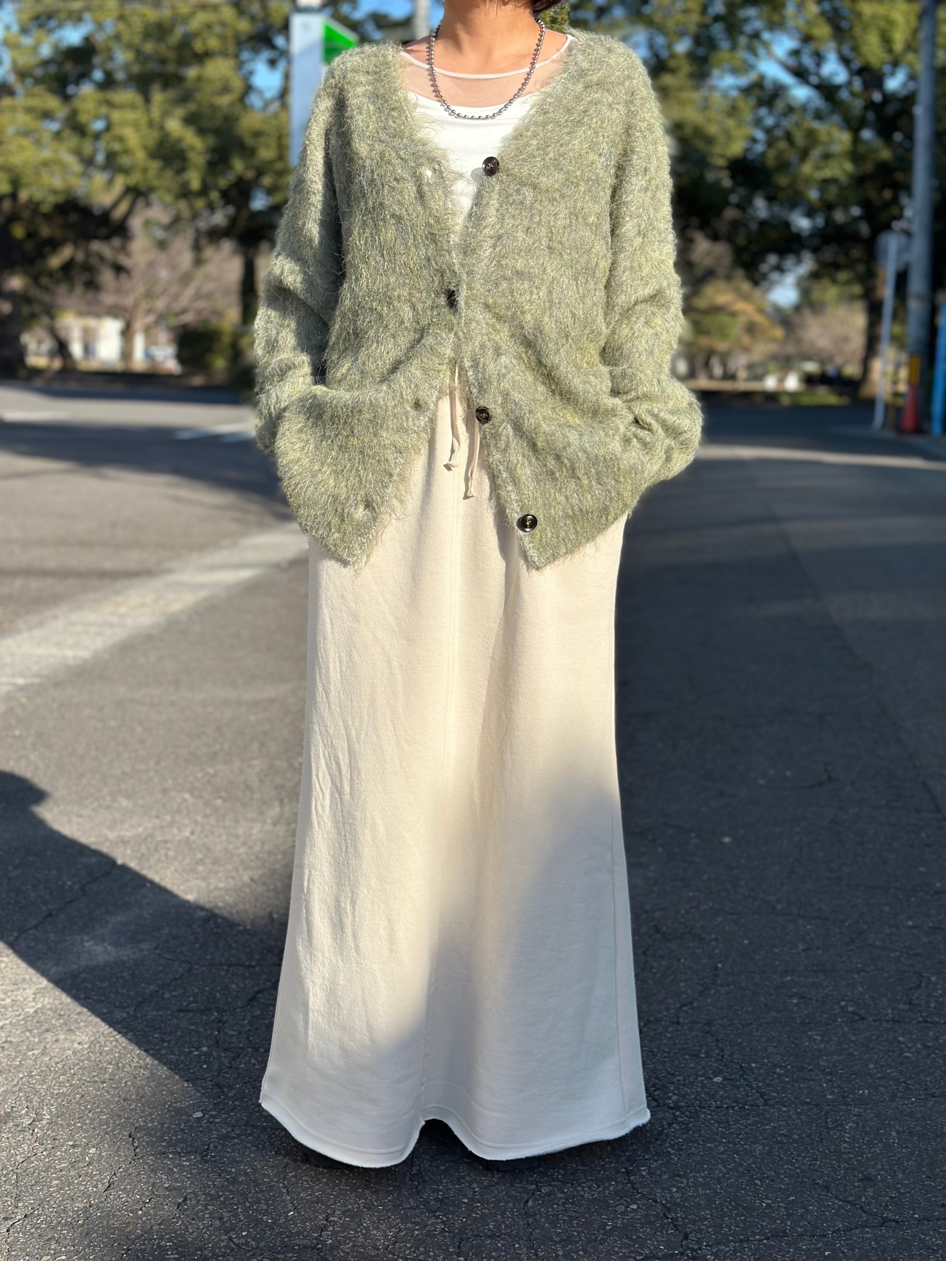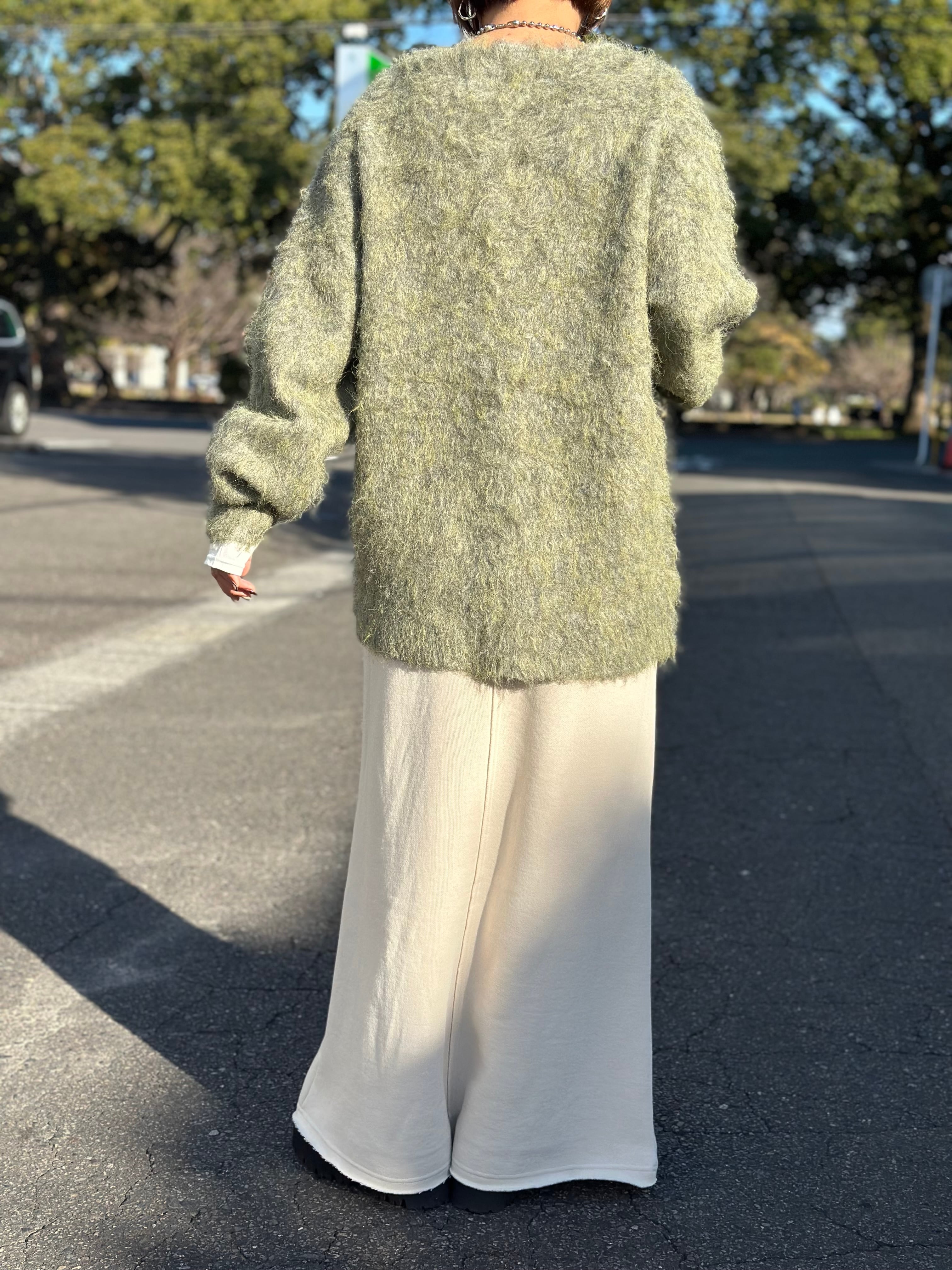 毛足長めで柔らかな風合いと絶妙な色合いが可愛いシャギーカーディガン。