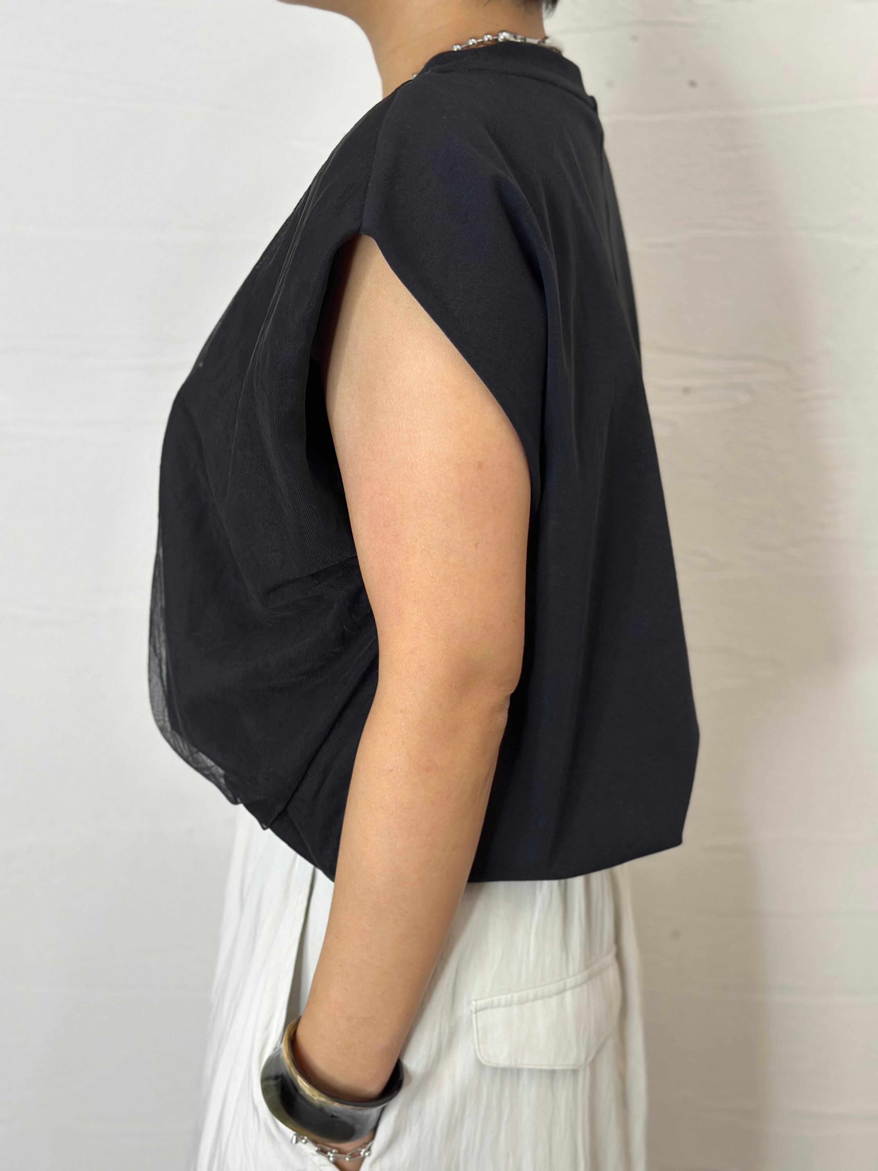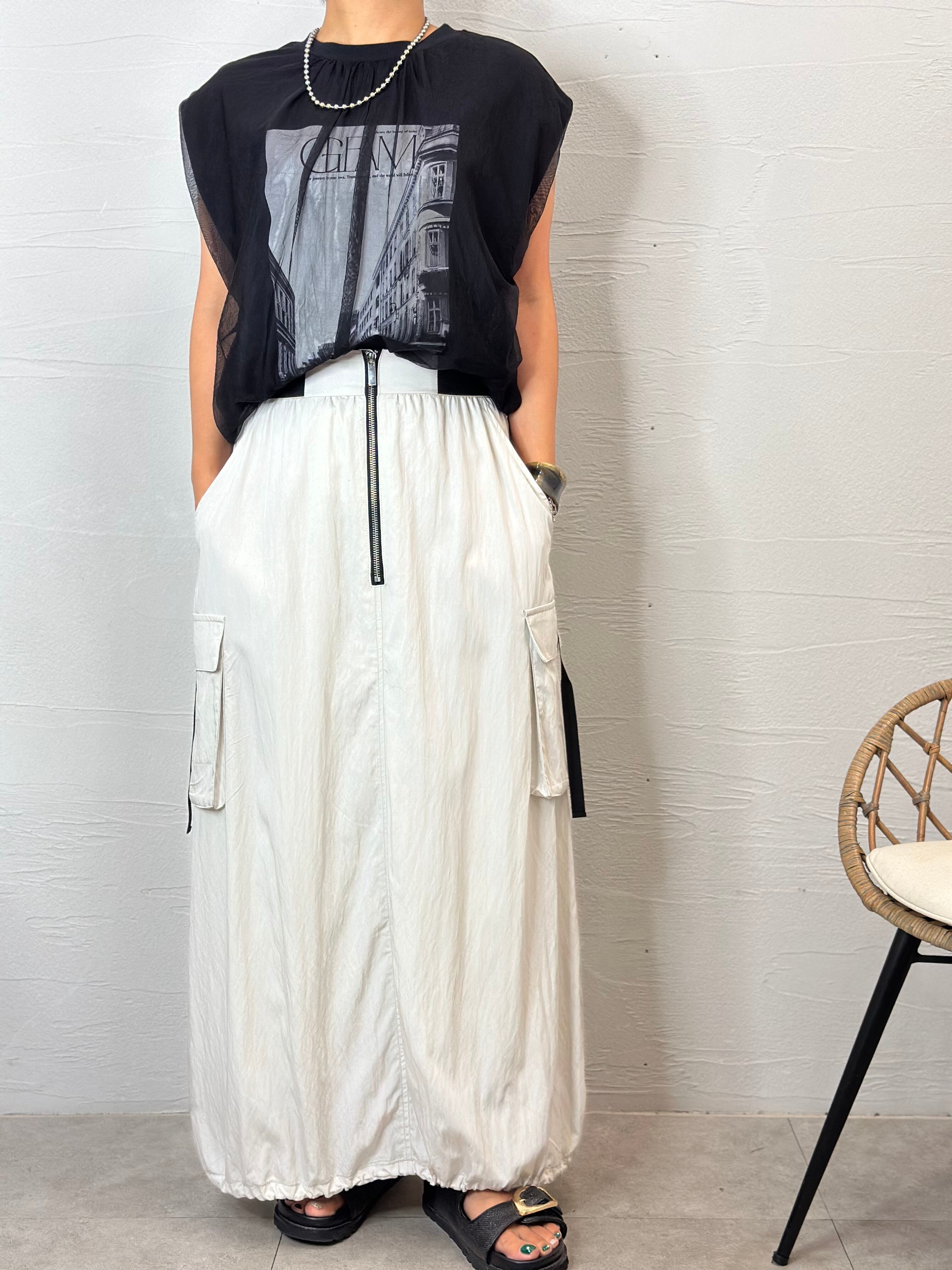 毛羽の少ないスムース加工のフォトTにチュールがドッキングされ立体感のあるシルエットに。