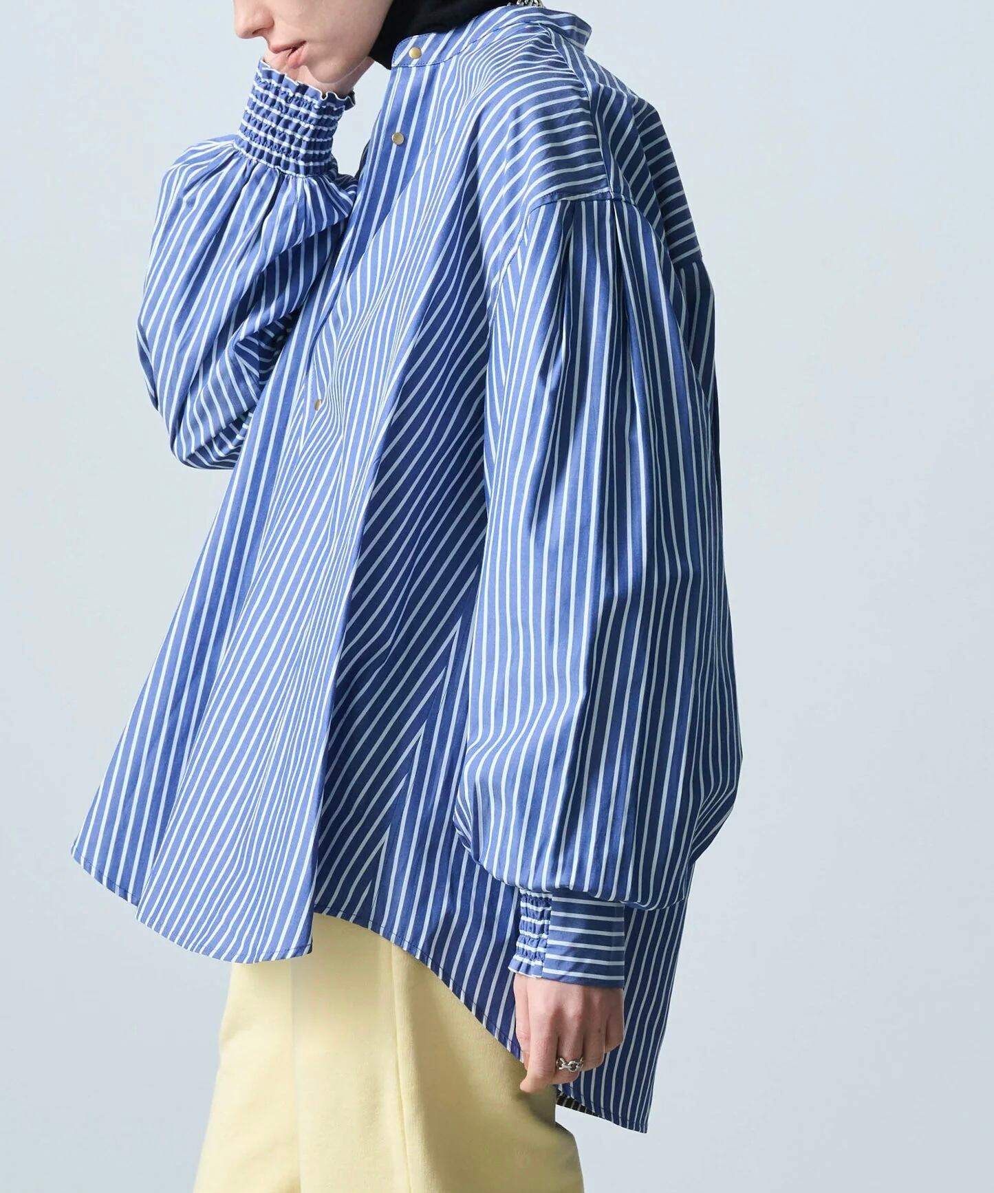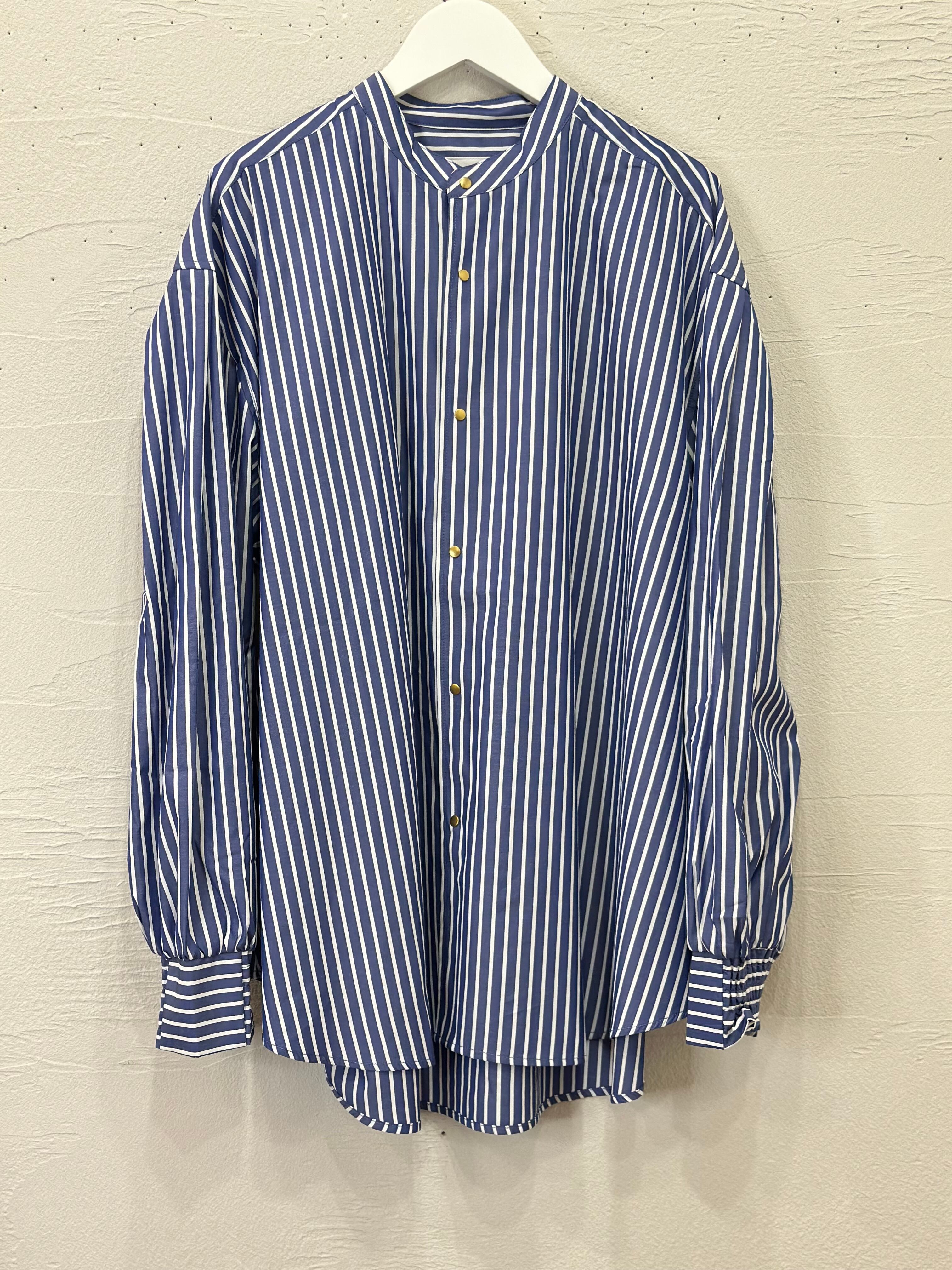 ボリューム感のある袖とゆったりとしたシルエットが特徴的なバンドカラーシャツです。
