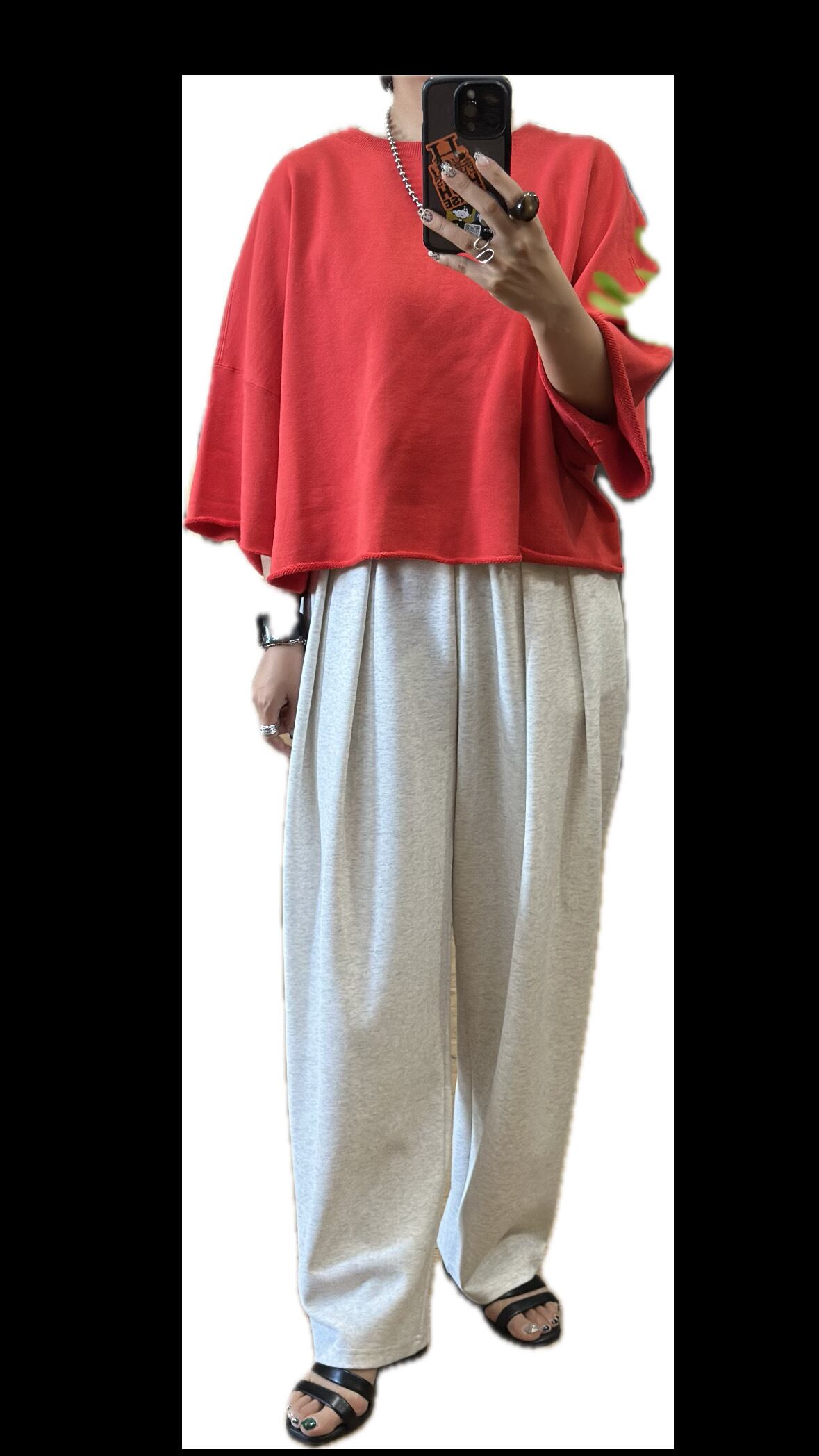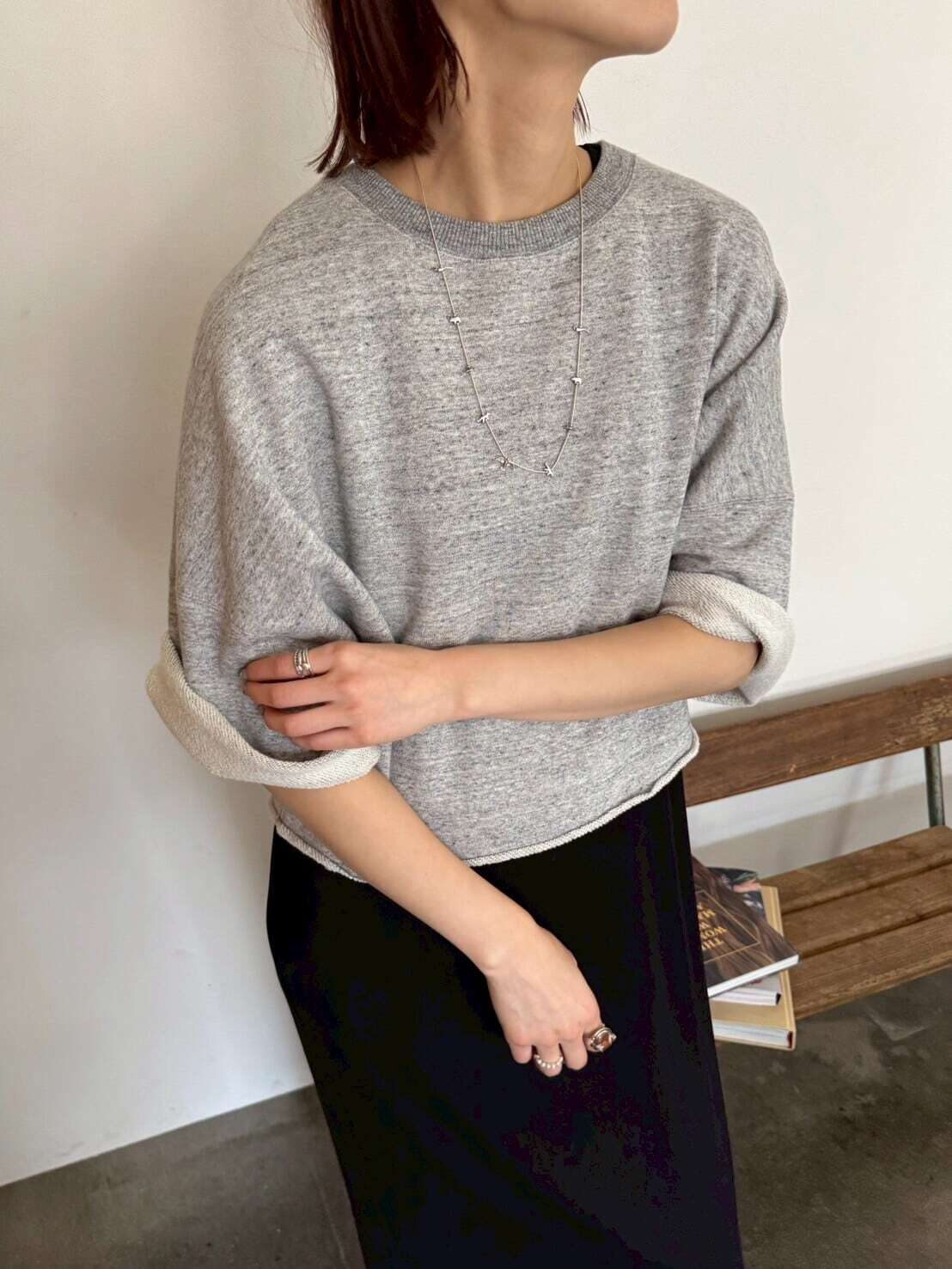 短めの丈感 × 太め&長めの袖ラインで、ゆるっと着るだけで自然に華奢見えが叶うシルエットに。