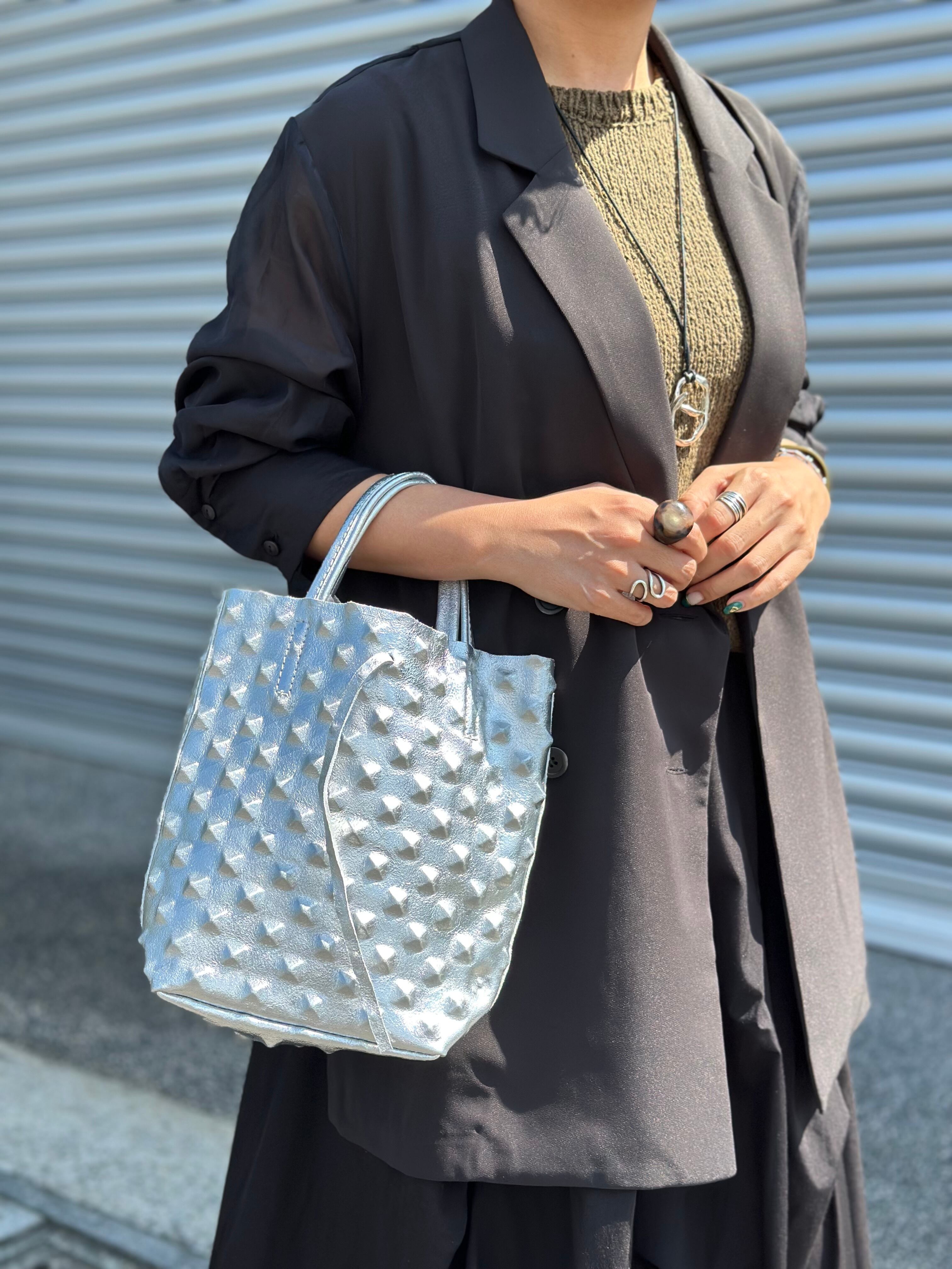 エンボス加工を施し、スタッズを表現したミニトートバッグ。