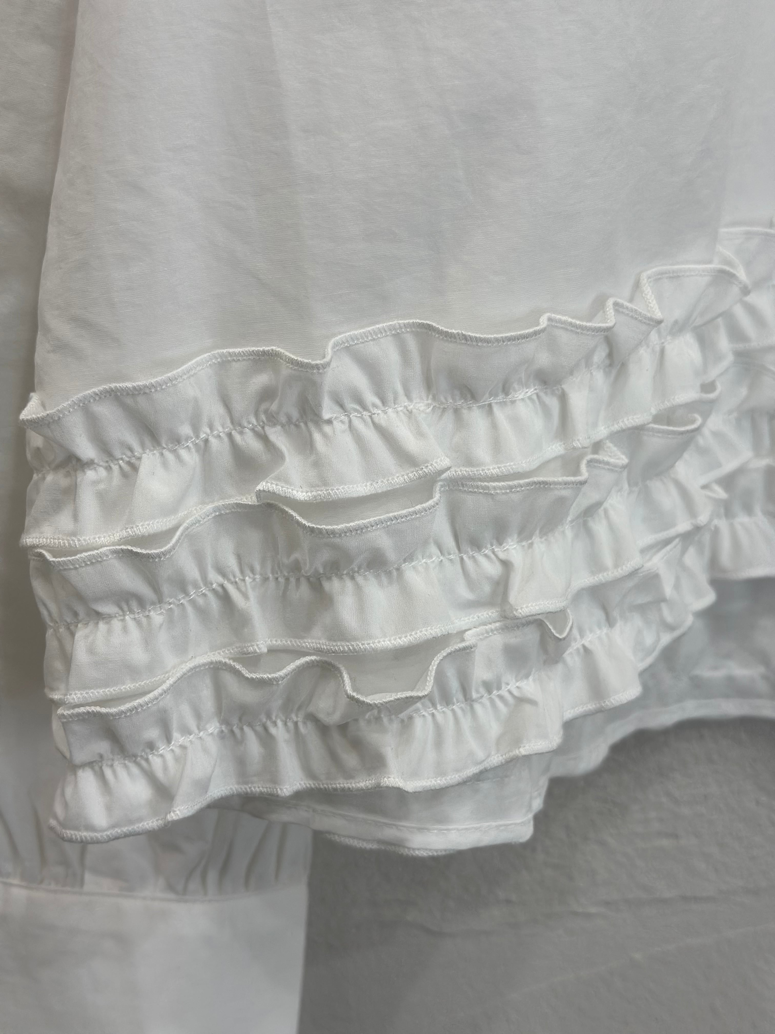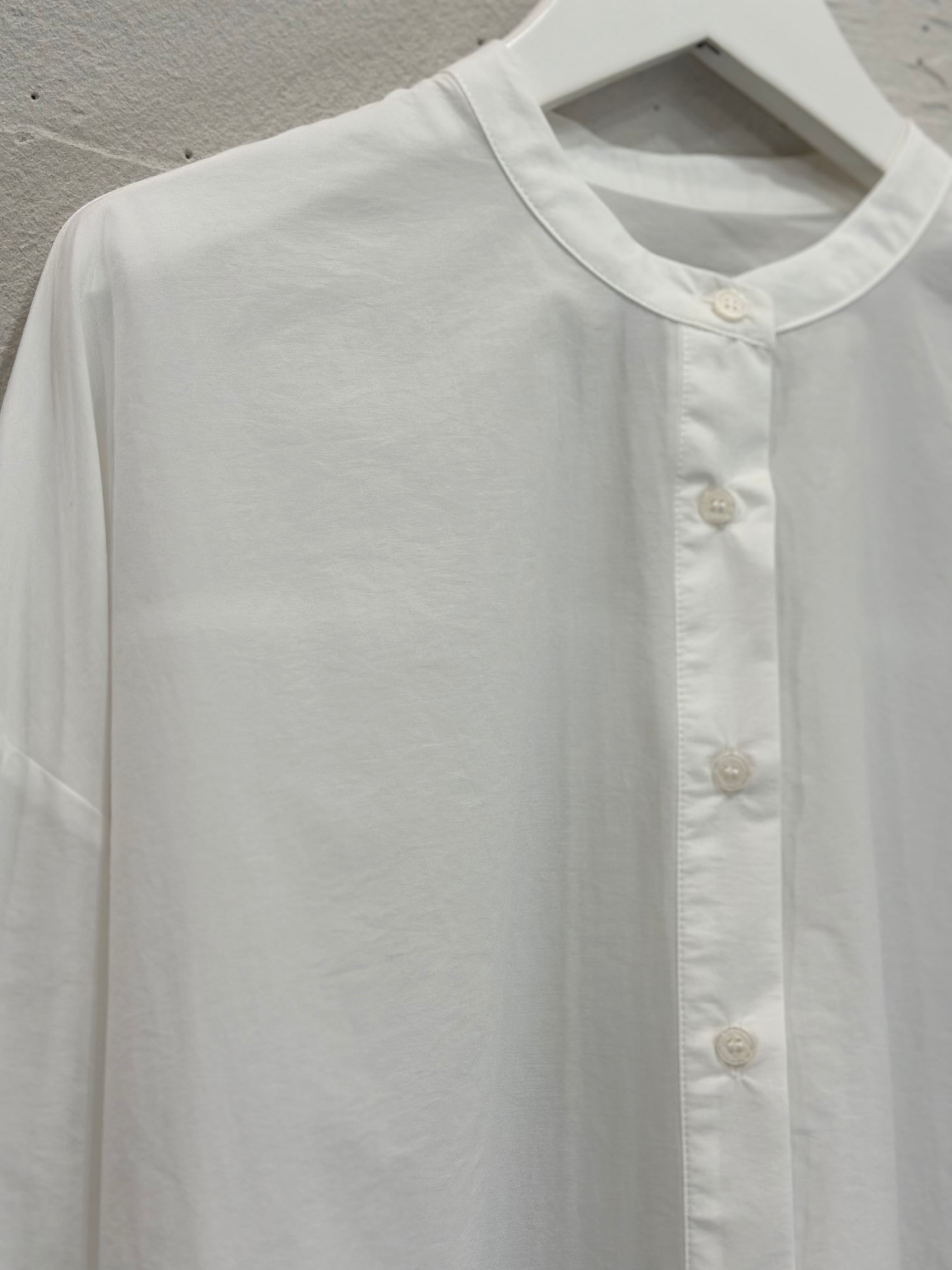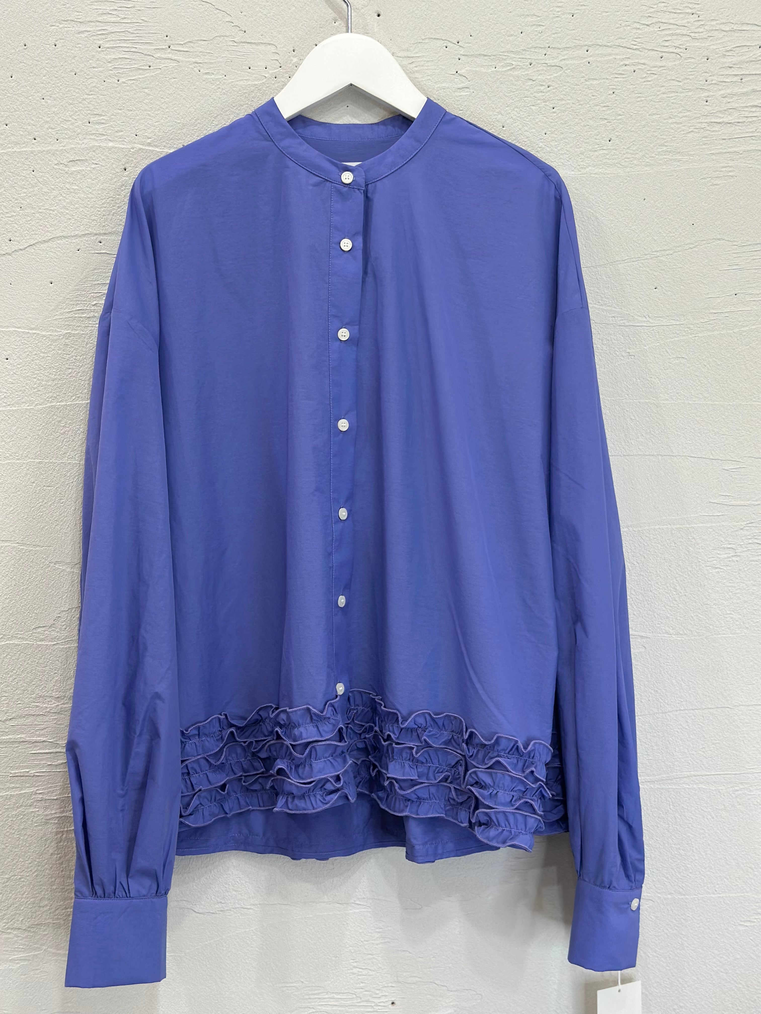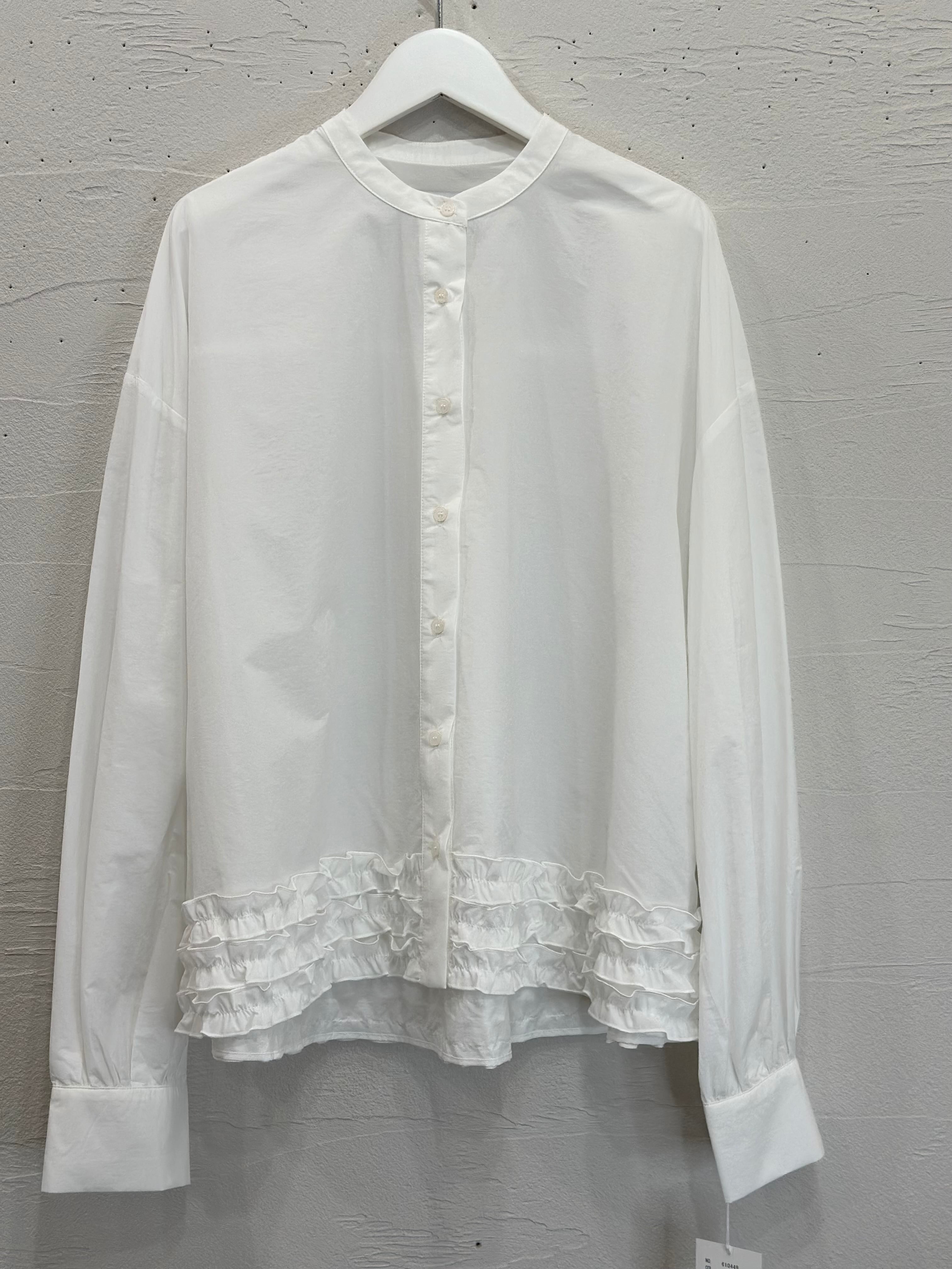 裾のティアードフリルが大人可愛いノーカラーシャツです。
