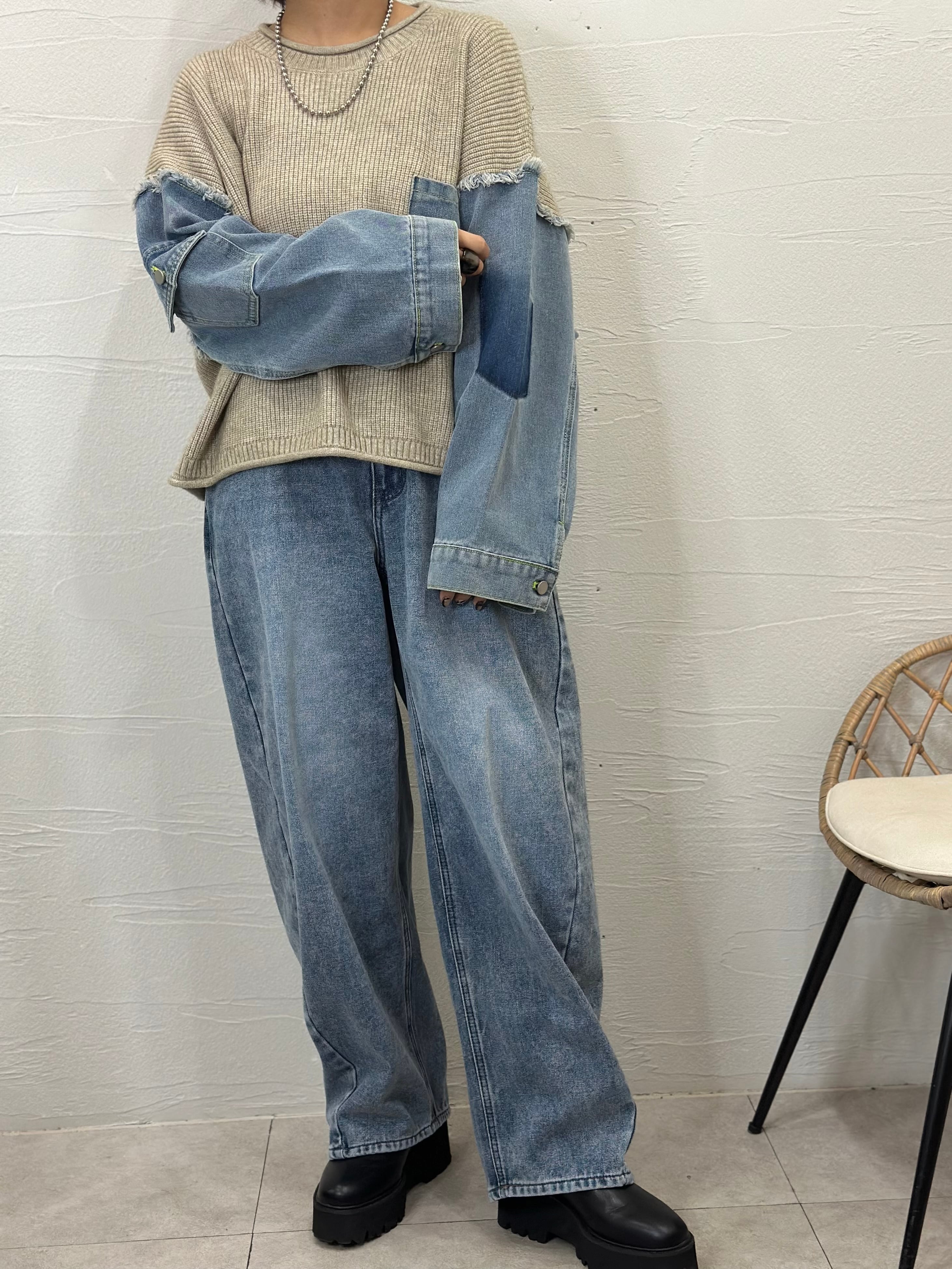 ニットとデニムの大胆なドッキングデザインがオシャレな1枚。
