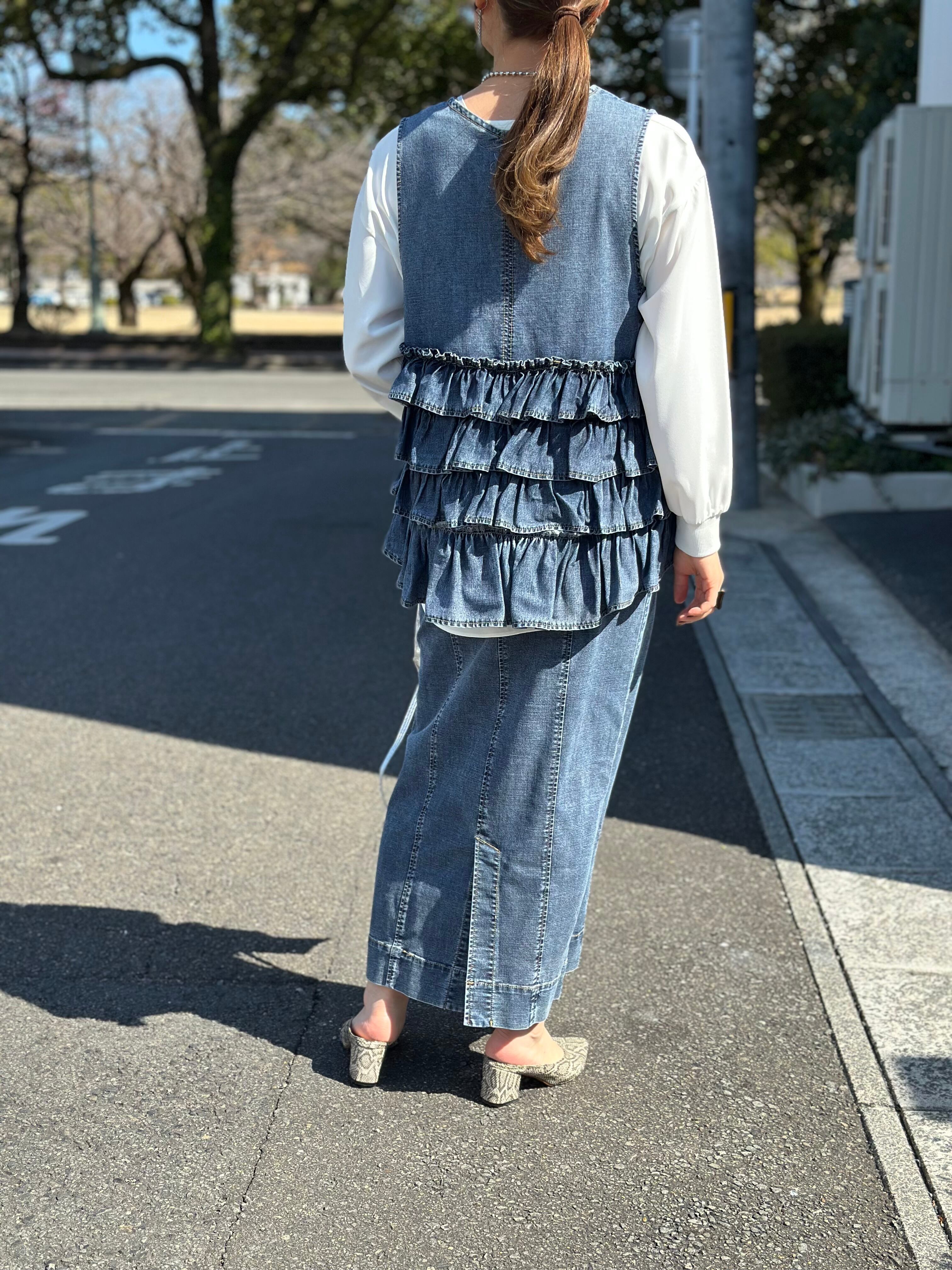 同素材のバックフリルベストやデニムジャケットと合わせたセットアップスタイルもオススメです。