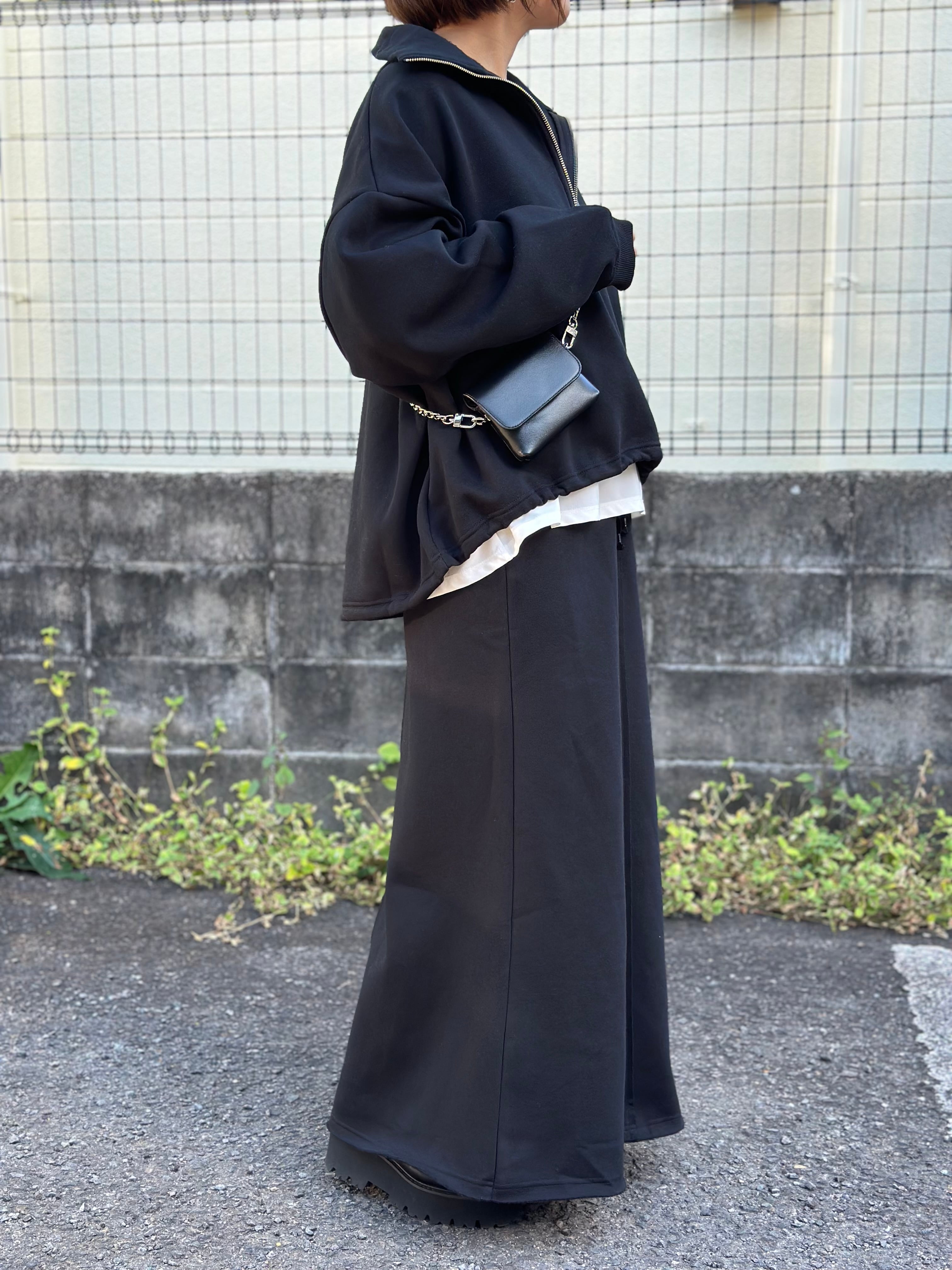スウェット素材ながらフレアシルエットで女性らしさもmixされたスカートです。
