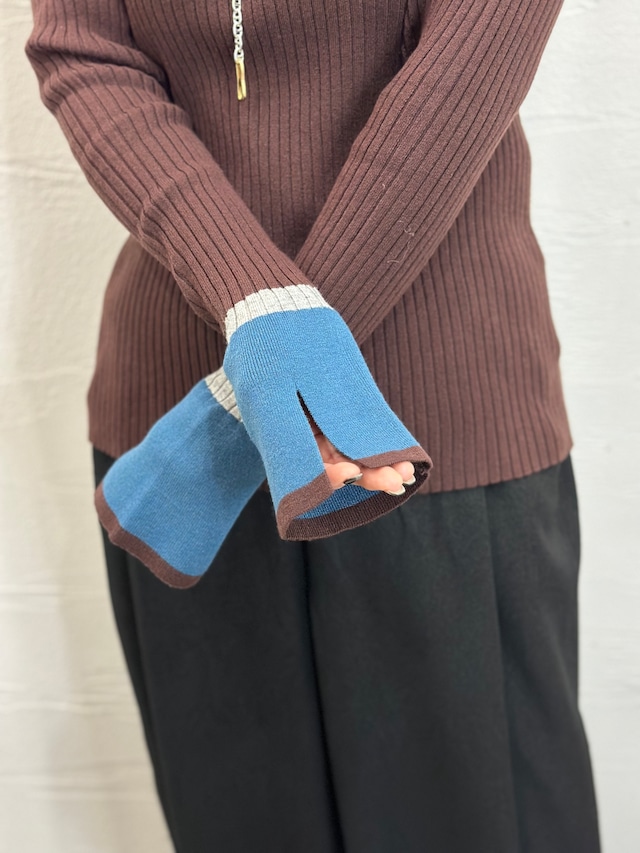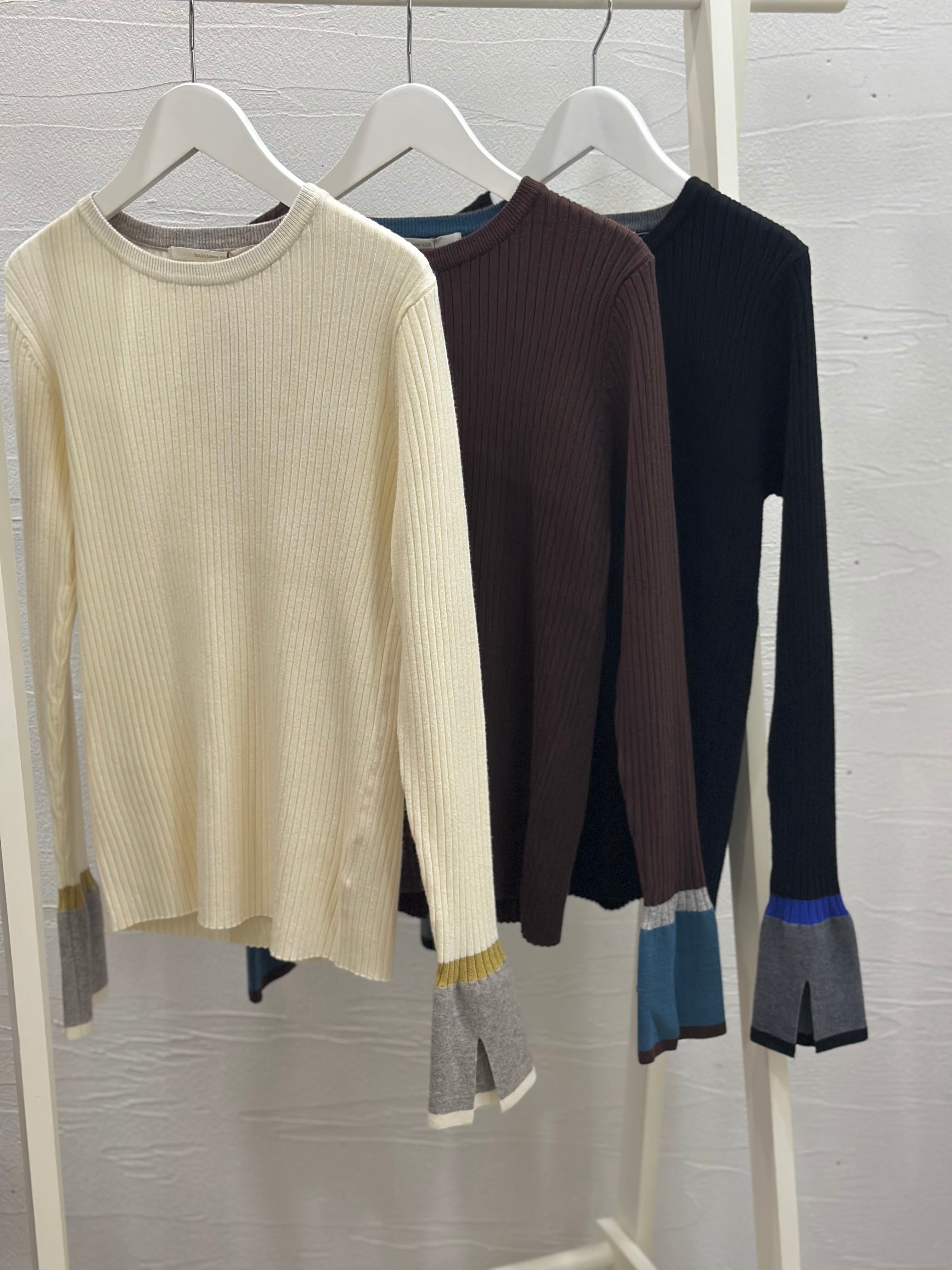袖口の配色とスリットがトレンド感たっぷりのリブニット。