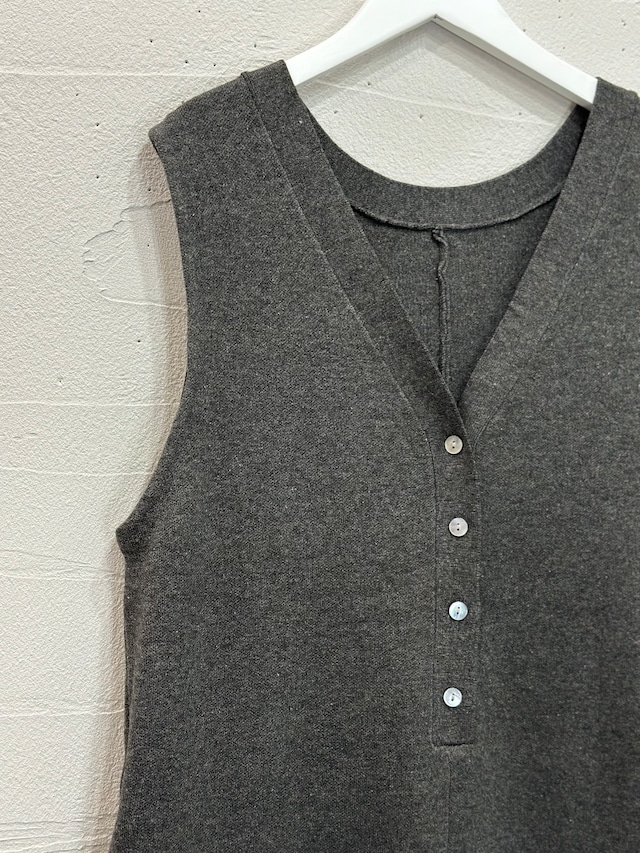 深めのV開きでスッキリとした印象ながら伸縮性もあり、ゆとりのあるつくりなので超絶楽ちんな着心地です。