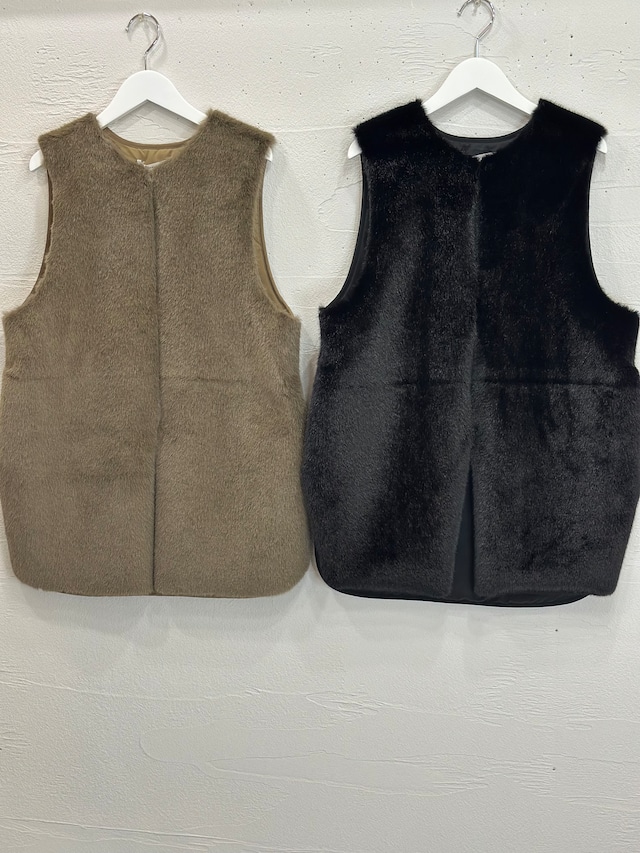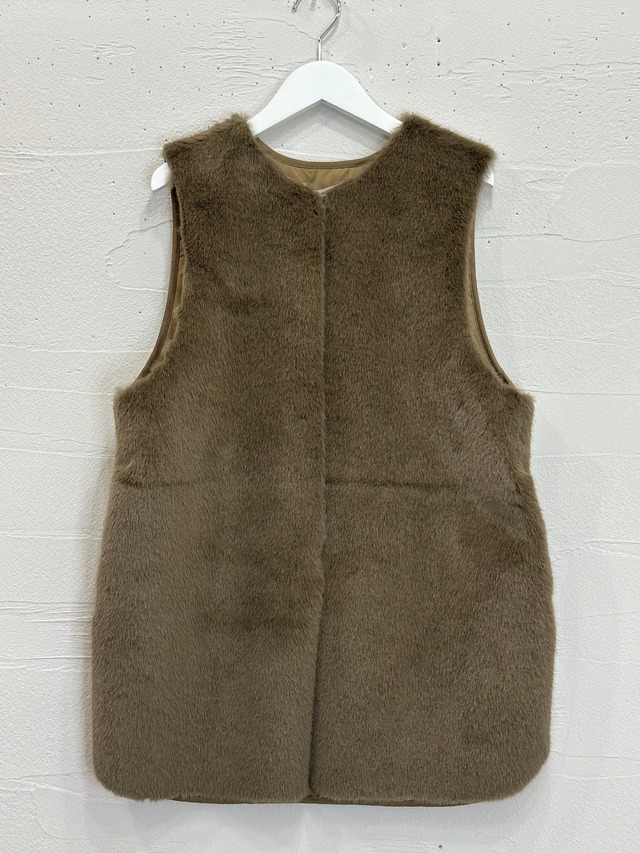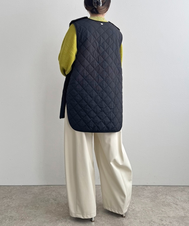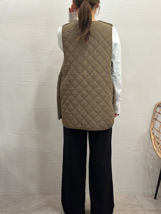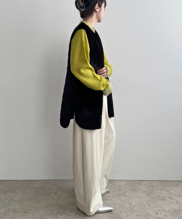 前はファーとスウェードのボンディング素材、後ろは中綿入りキルティングの薄手ながら保温性も。