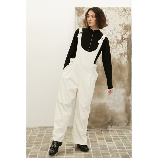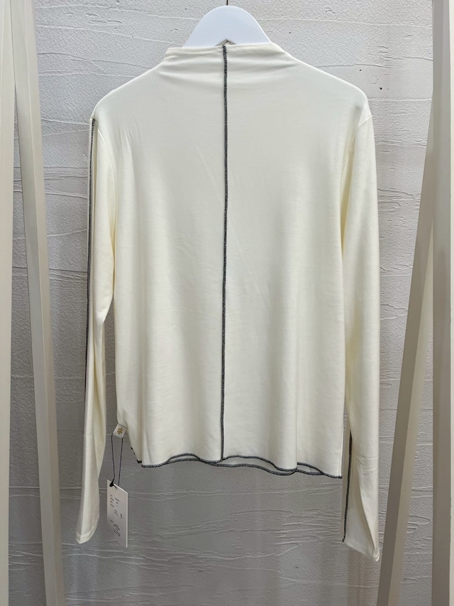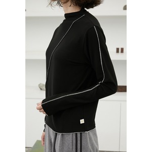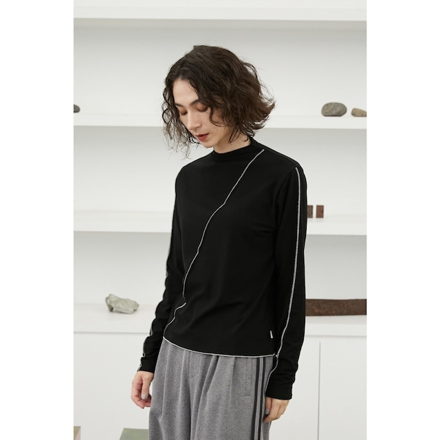 前身頃は肩から裾にかけて斜めに走るラインがモードな印象を与え、後ろ身頃は首元から裾までストレートに落ちるラインでシンプルかつ洗練された表情に。