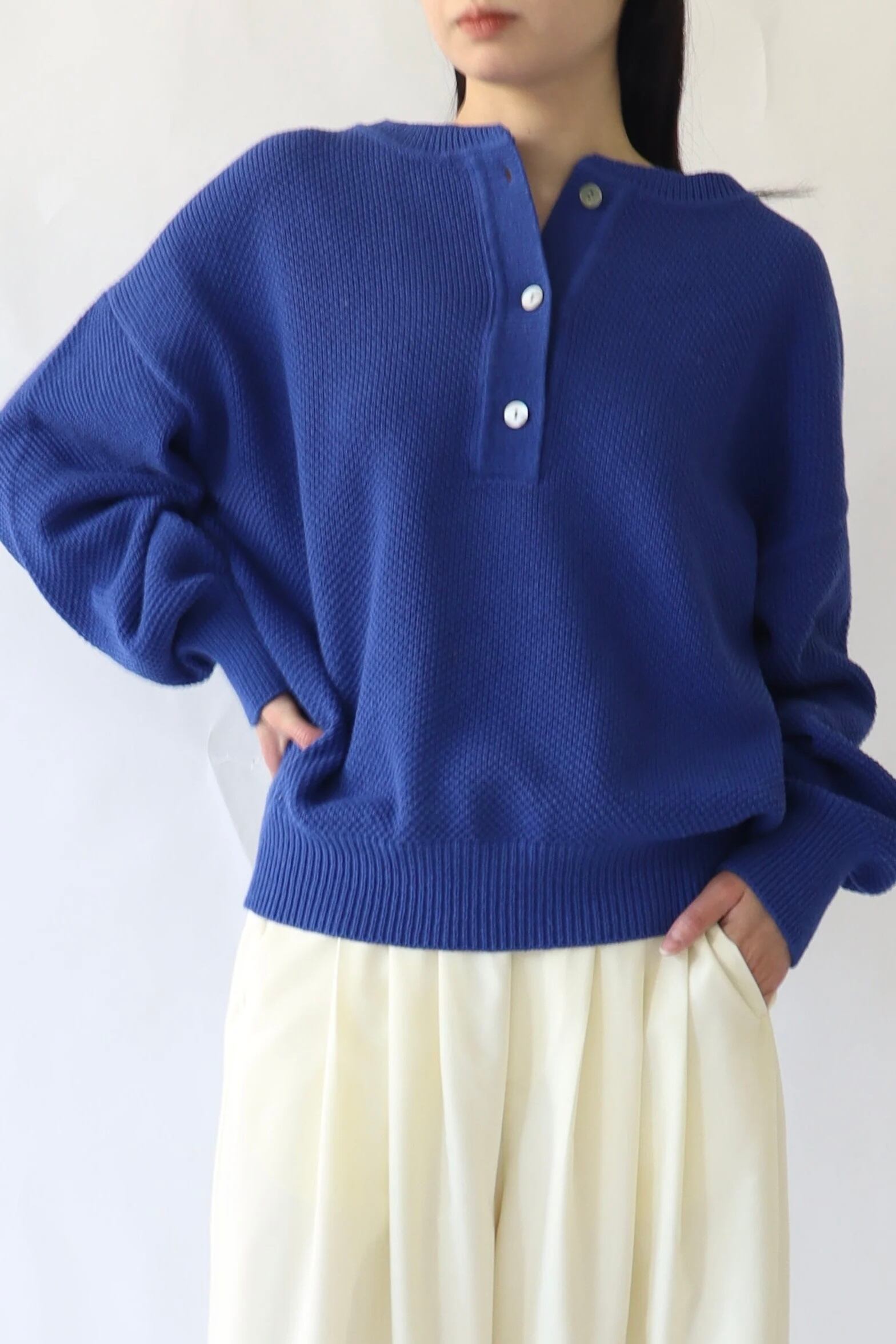 ゆったりしたサイズ感のヘンリーネックのニットプルオーバー。