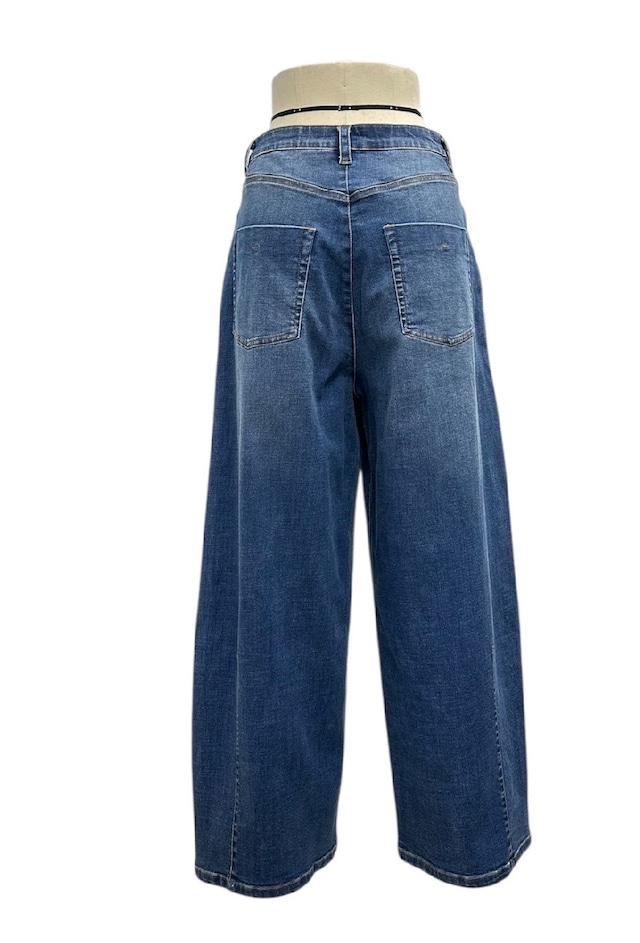 ウエストは内側平ゴムで楽々な履き心地のバレルデニム。