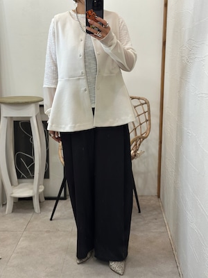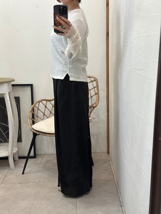 衿端と袖口はストレッチシフォン生地で切り替えられており、1枚使いはもちろんニットなどのインナーとしてもオススメです。