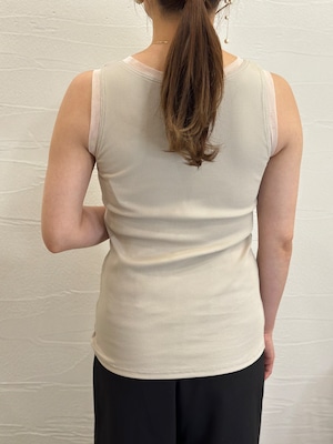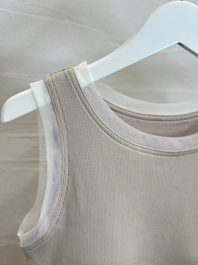 襟ぐりとアームホールのチュールがポイントのカップ付きタンクトップ。