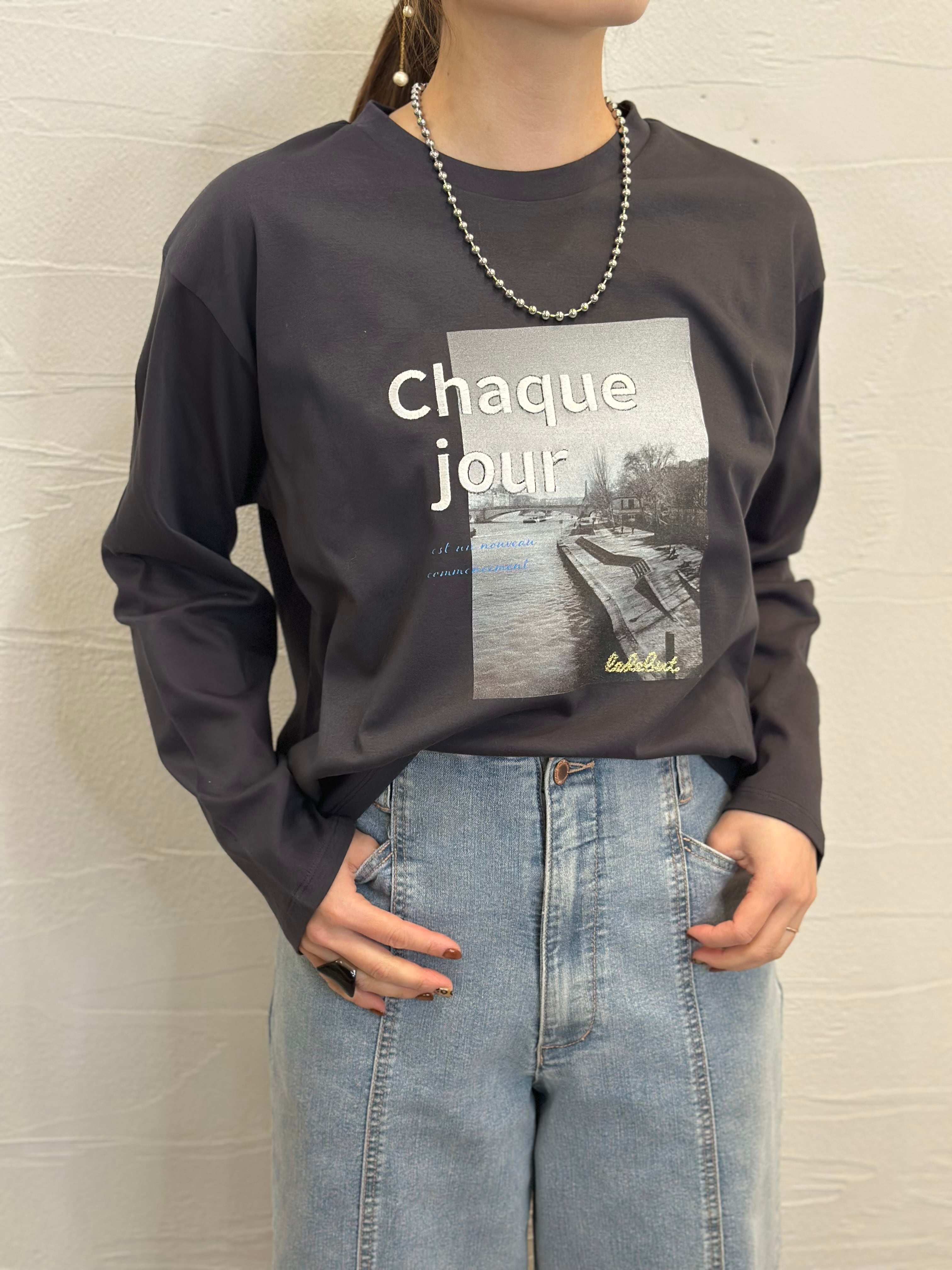 フォトプリントの上に、ロゴ刺繍とラメ刺繍を施された、シンプルなフォトTとは一味違う1枚。