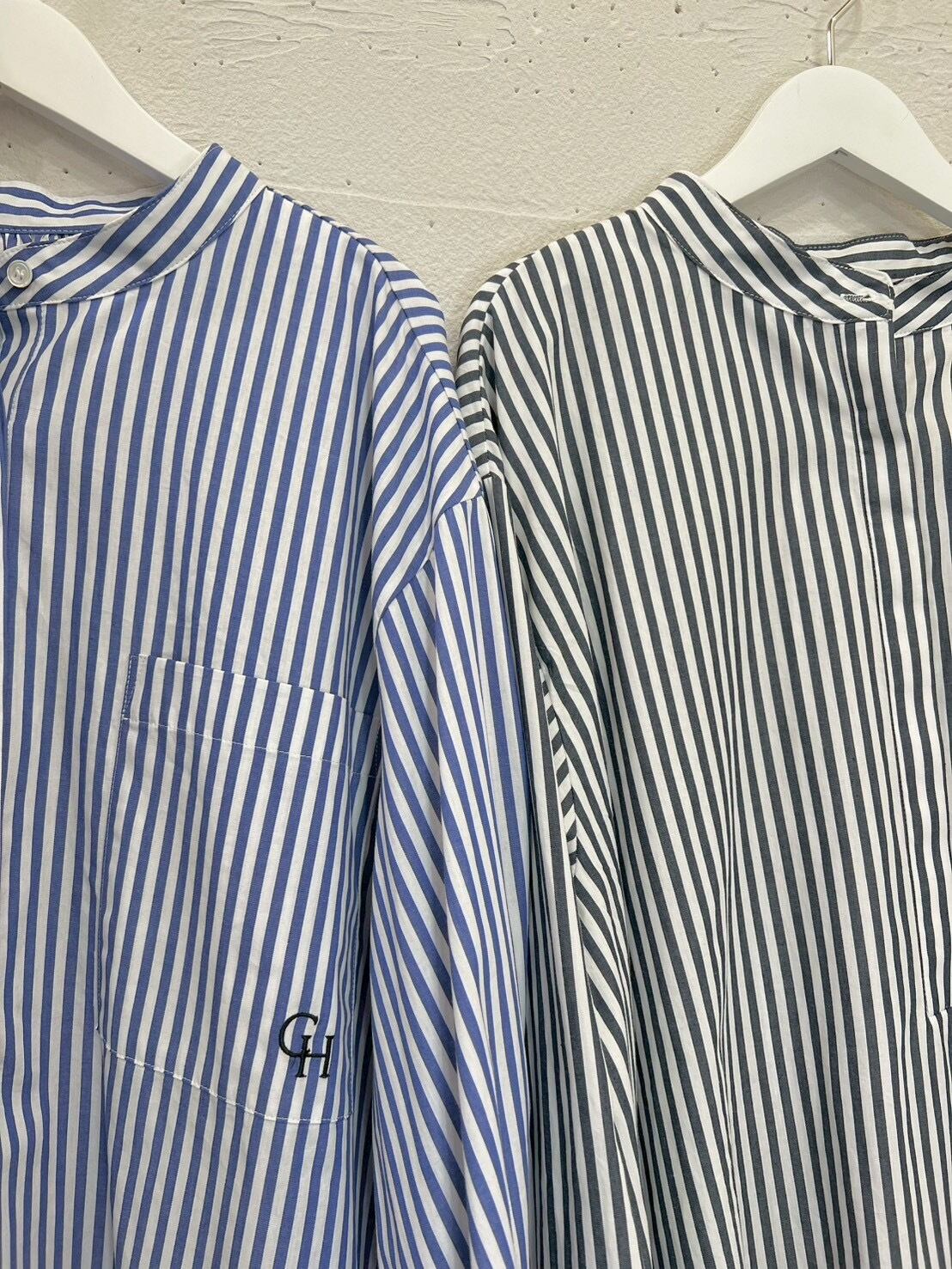 チュニック丈のストライプスキッパーシャツ。