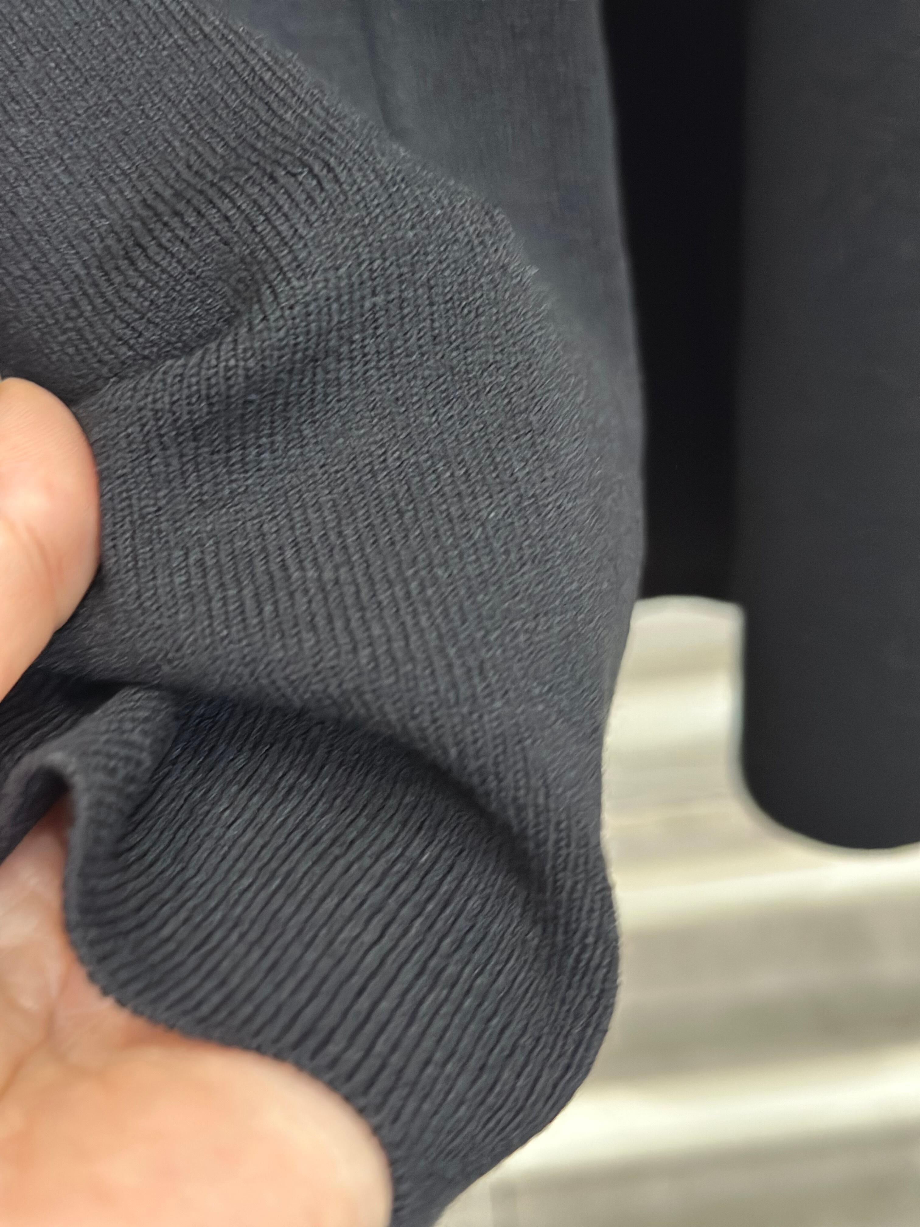 レーヨン混で程よく落ち感もあり着用するとスッキリとしたシルエットに。