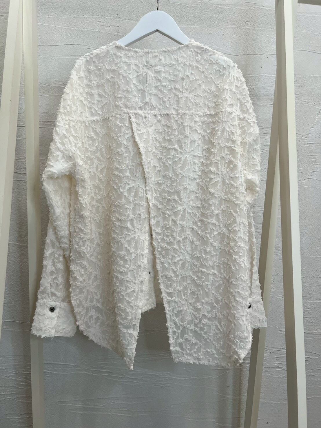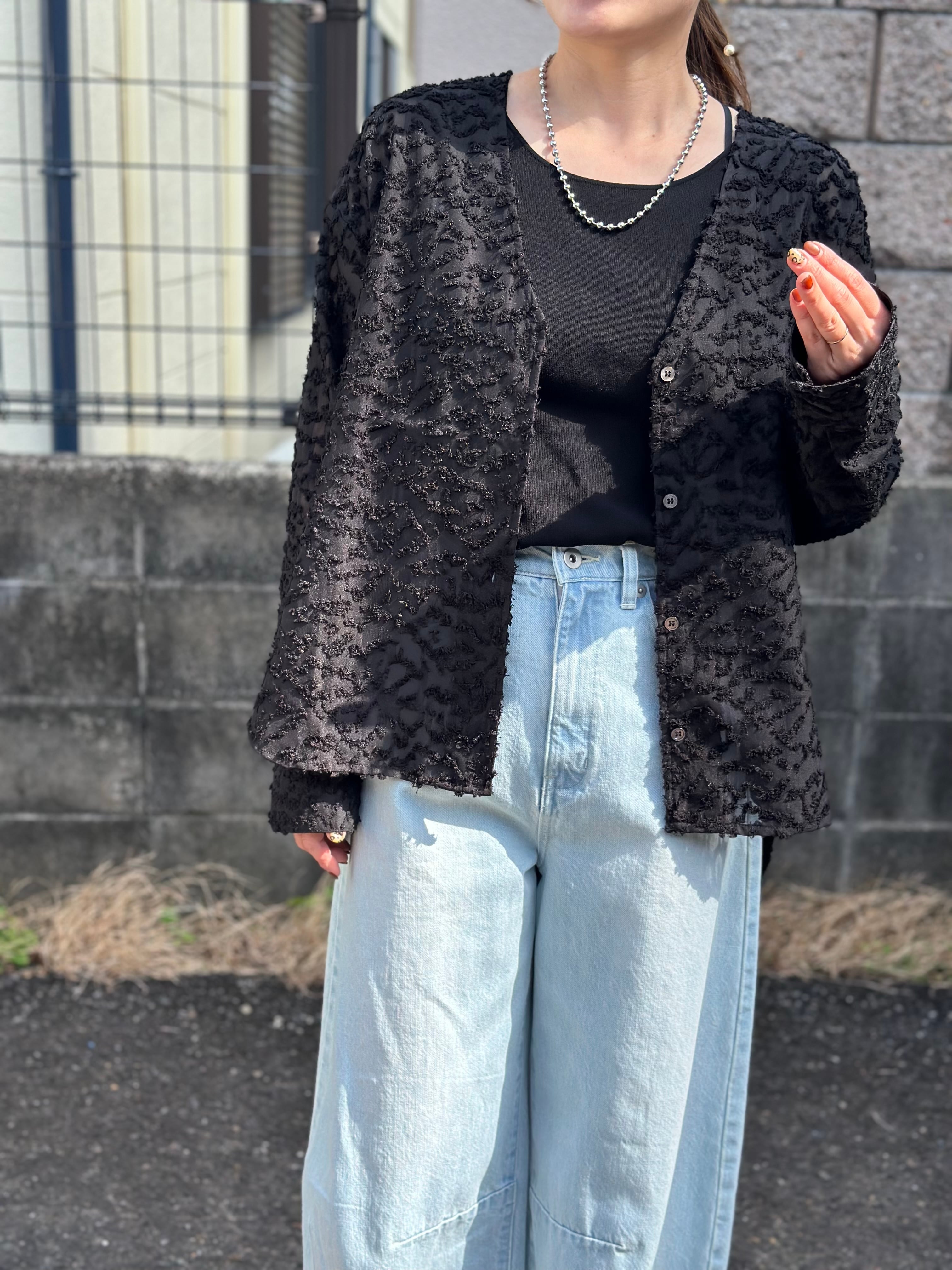 立体感があり華やかで表情があるカットジャガード素材のノーカラーシャツです。