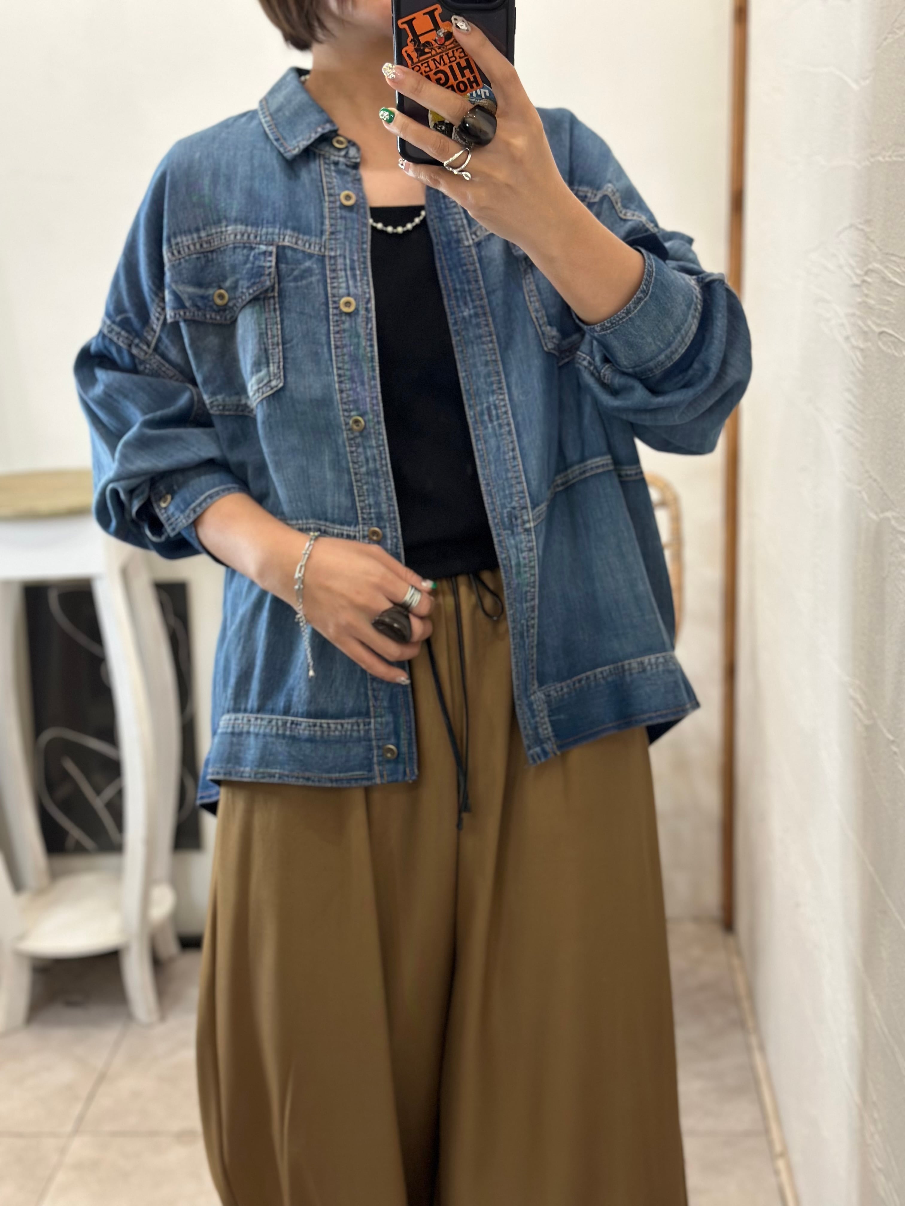 生地には軽さと柔らかさがあり、見た目だけでなく実際着ていても涼しいのが嬉しい極薄デニムで、落ち着いた透け感も大人っぽく、どことなく綺麗見えで女性らしいのがGOOD。