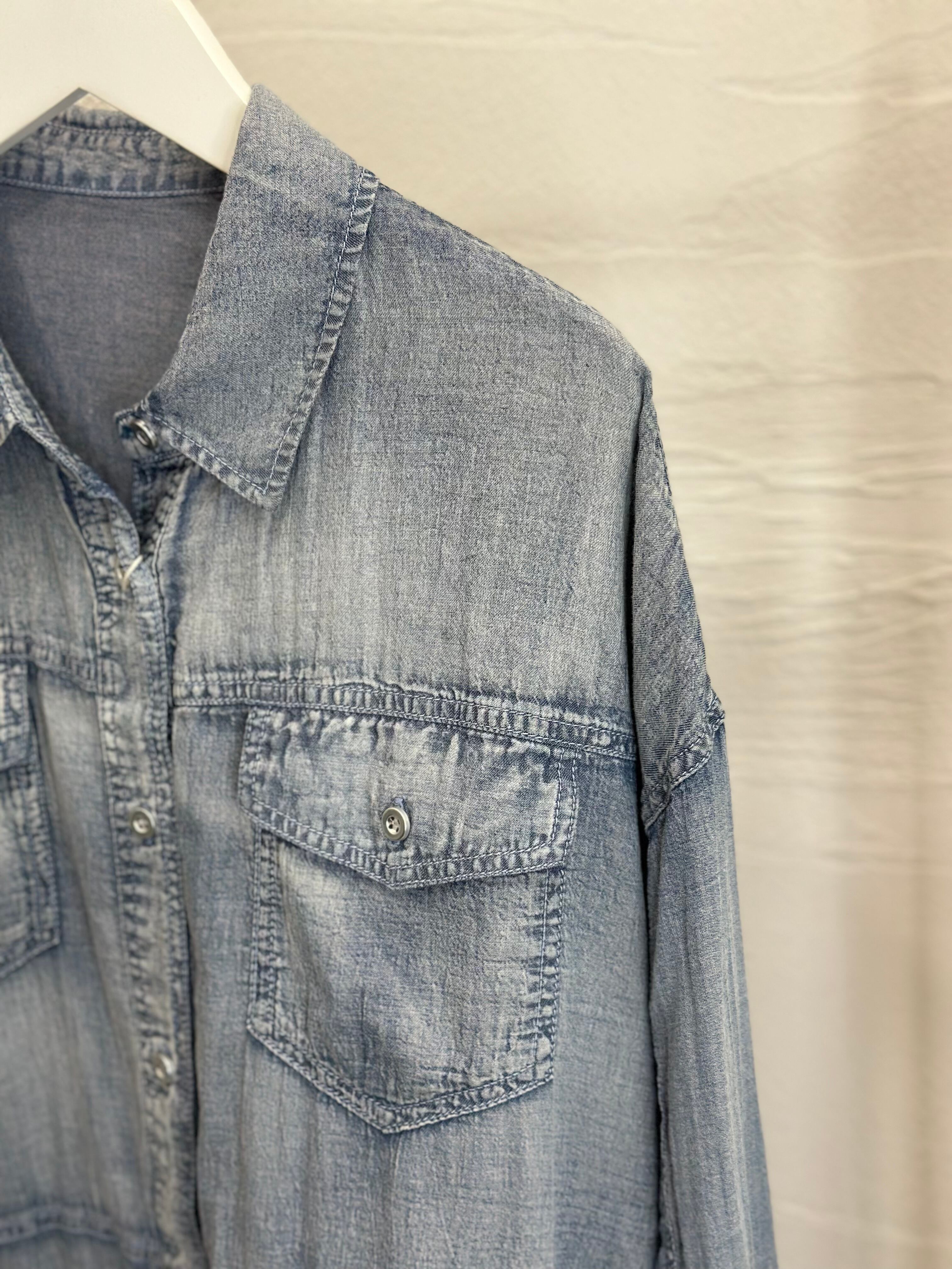 程よく透け感があり軽い羽織り心地のシアーデニムシャツ。