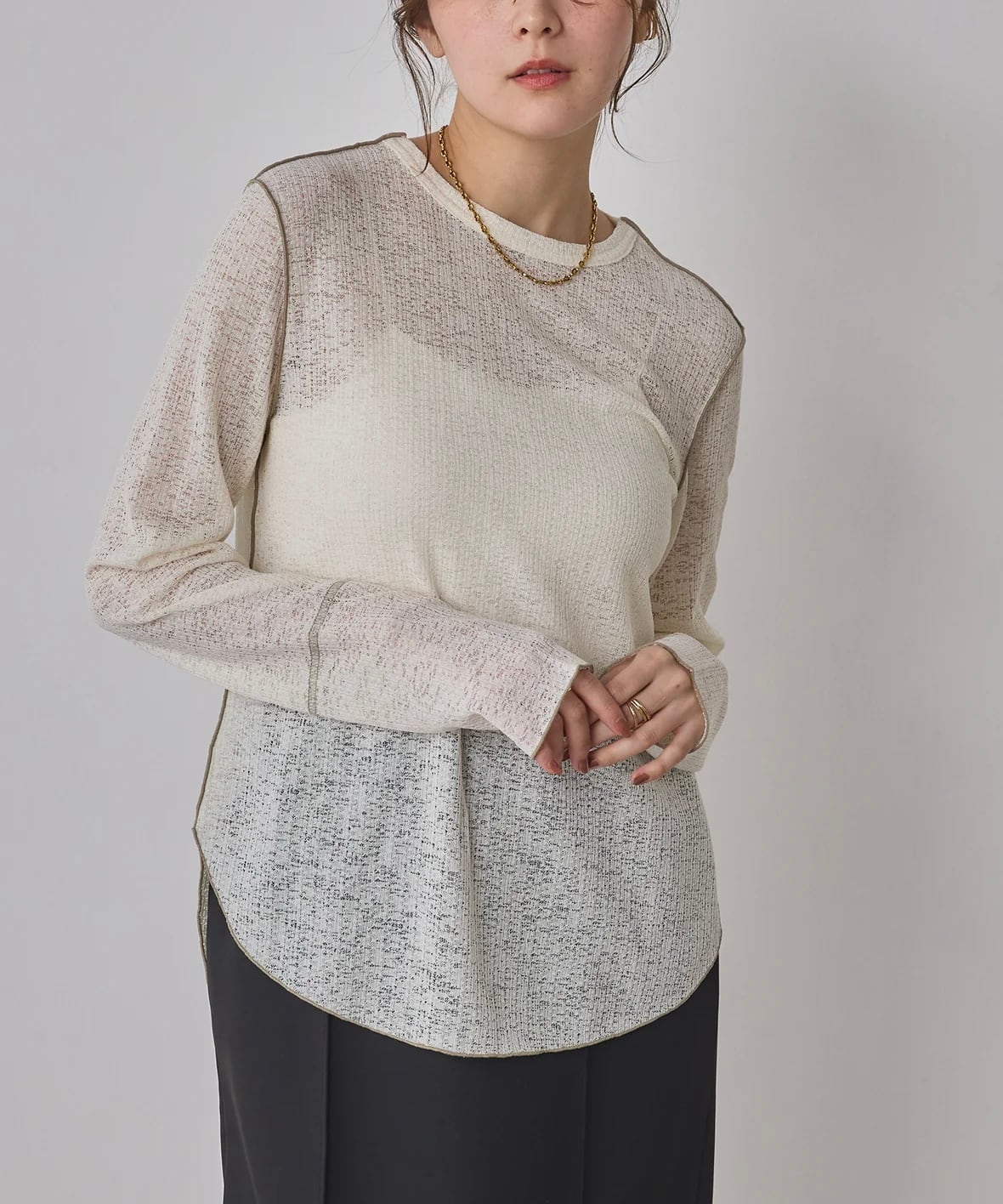 凹凸感のあるざっくりとした表情がポイント。透けすぎず、普段使いしやすい素材です。