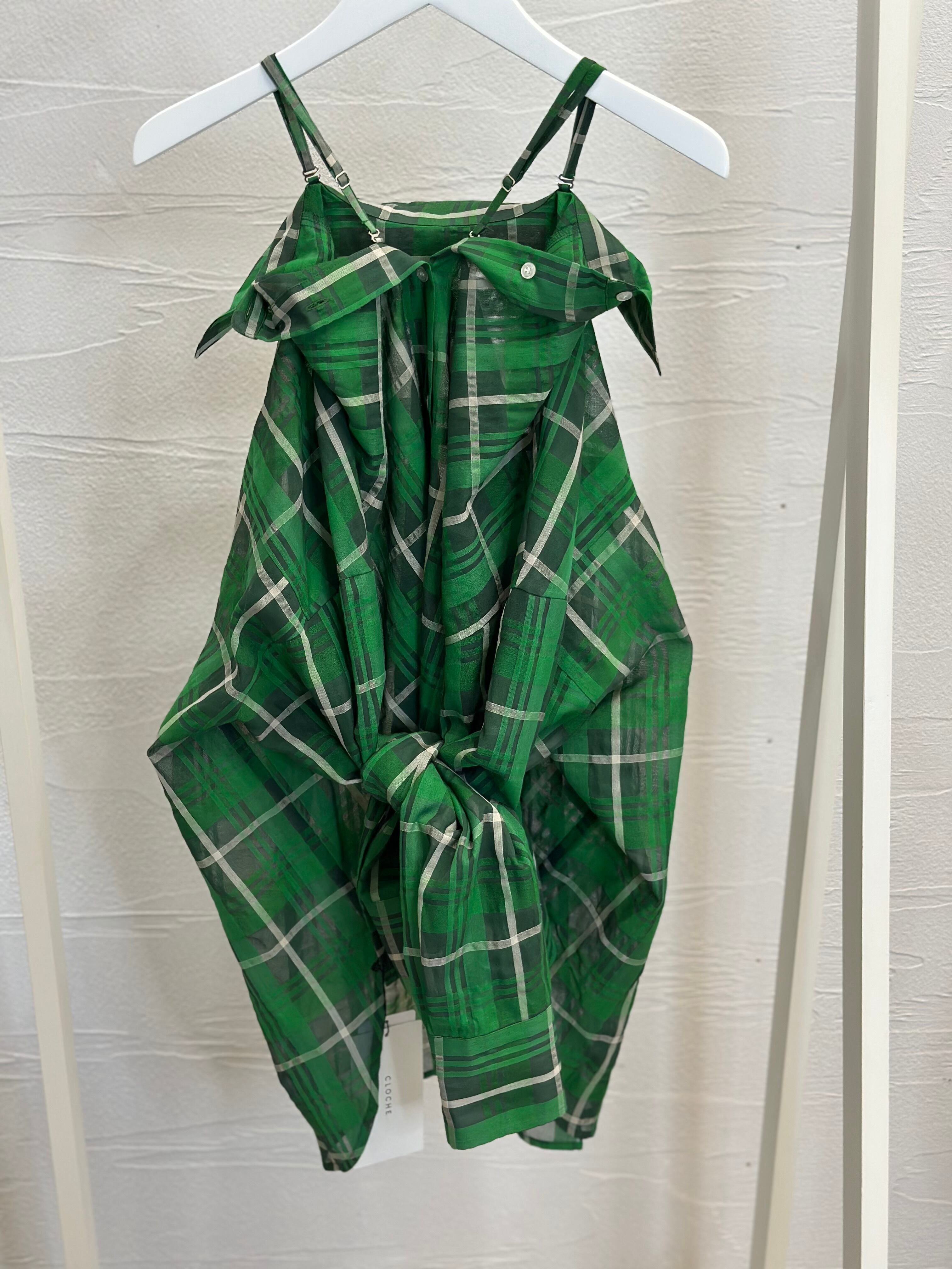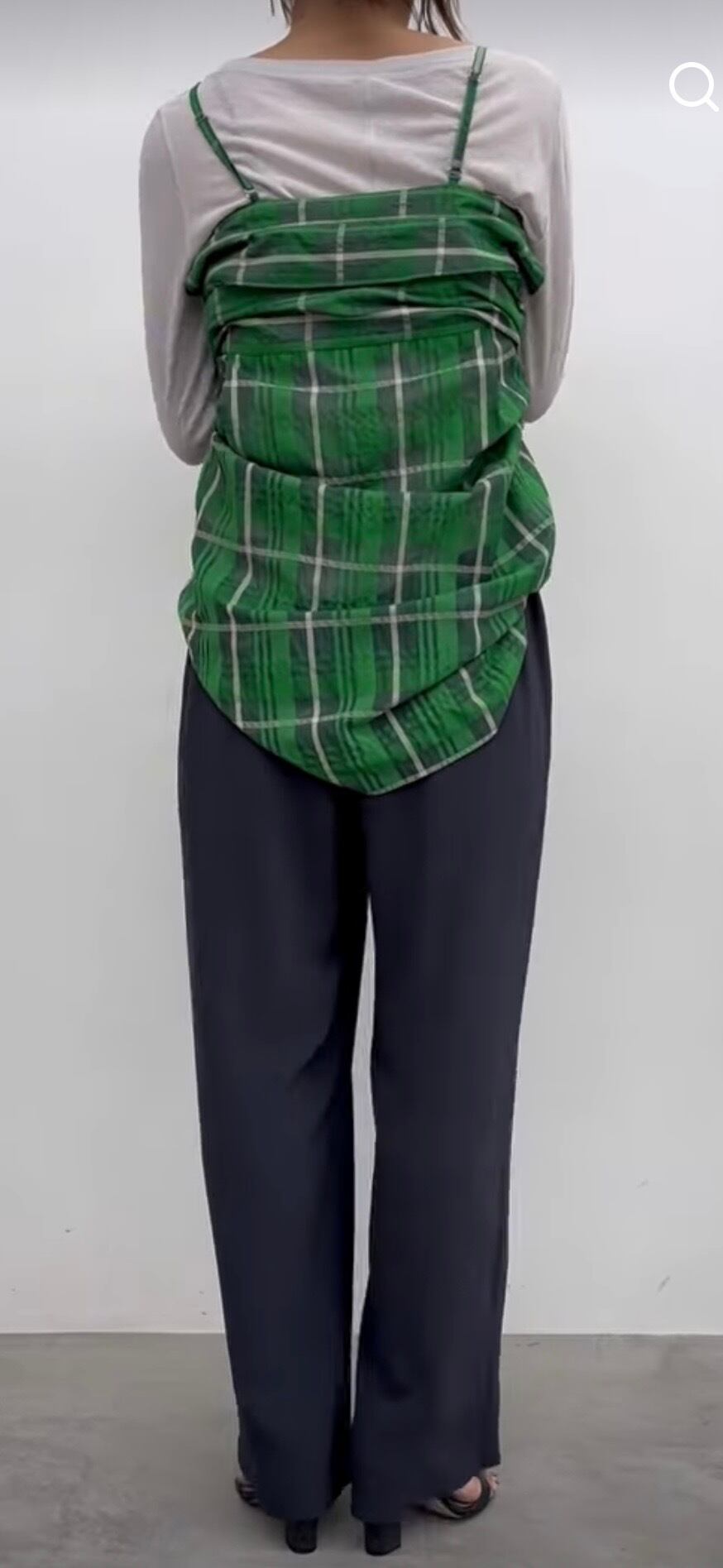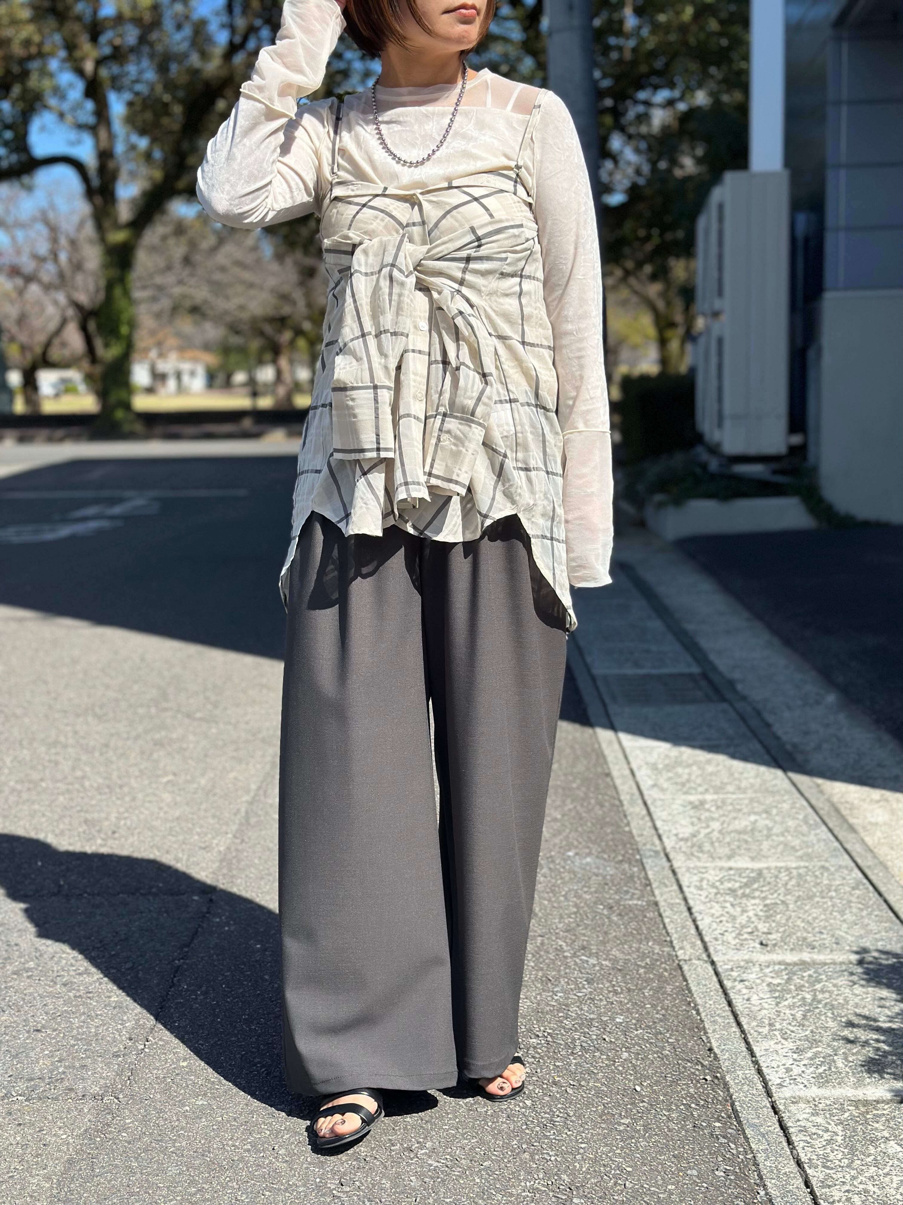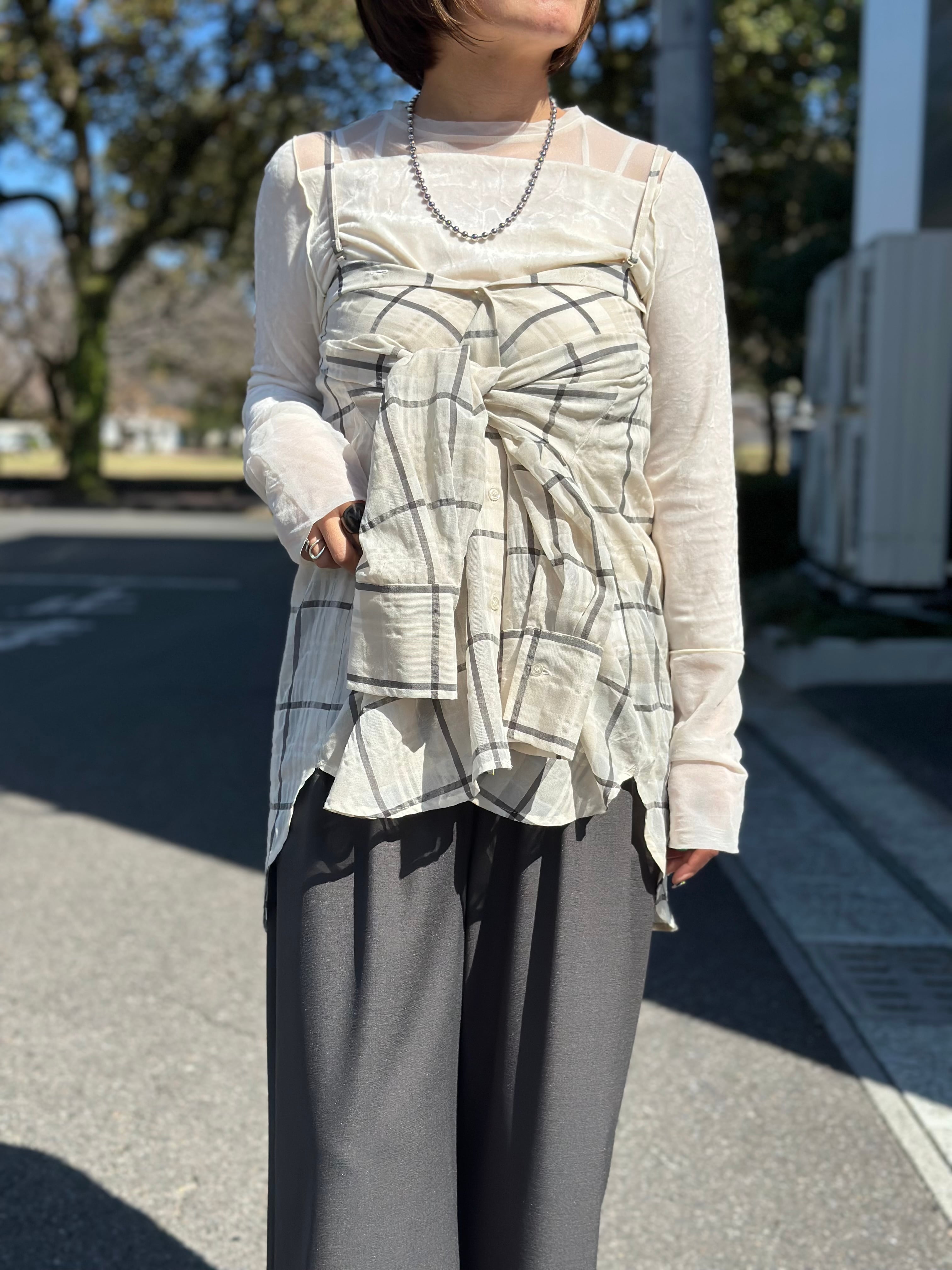 そのままノーマルに着用するのはもちろん、取り外し可能な肩紐が付いており、袖を胸元で結んだキャミソール使いとしてもお楽しみ頂けます。