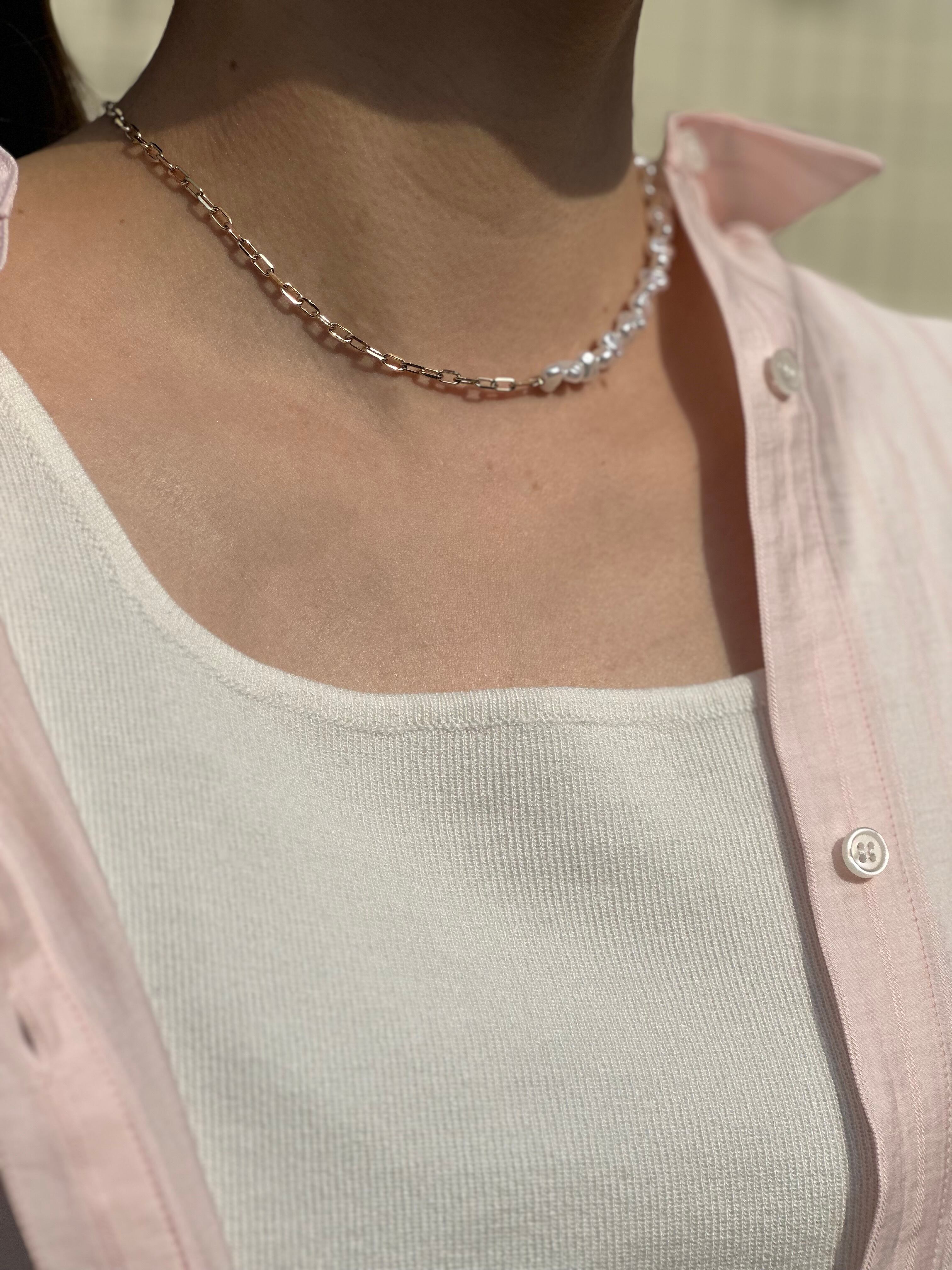 華奢なチェーンとパールがmixされたデザインネックレス。