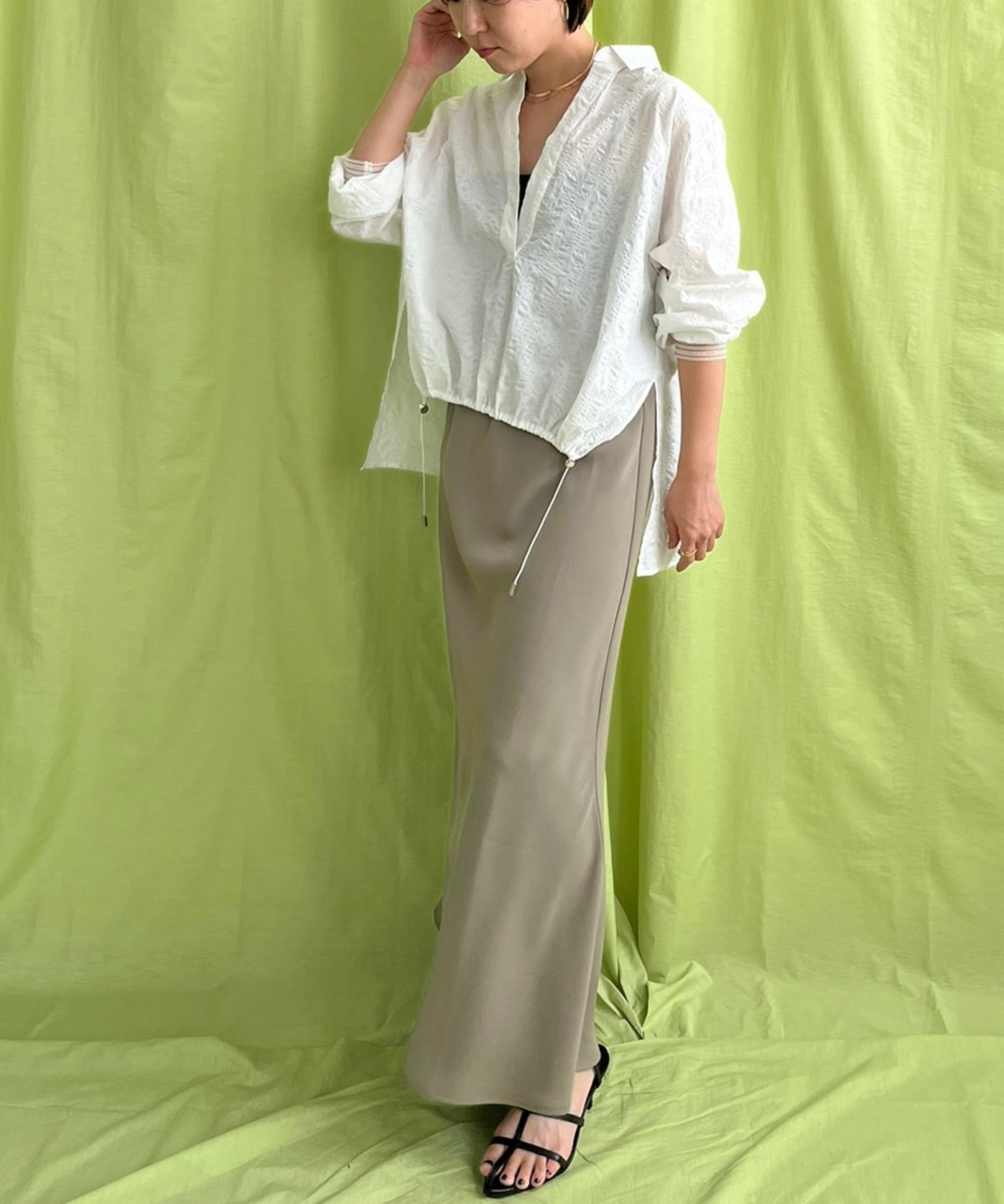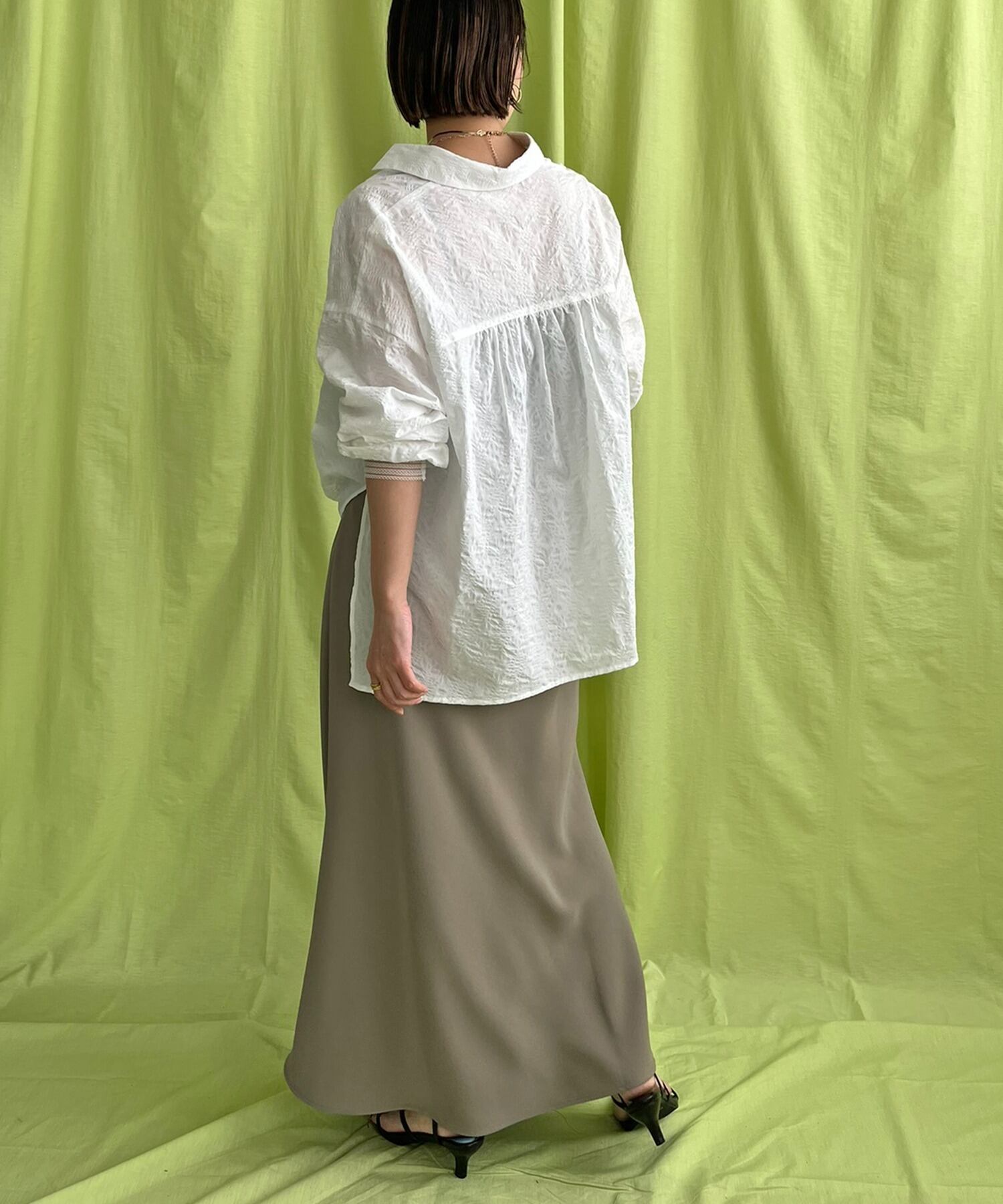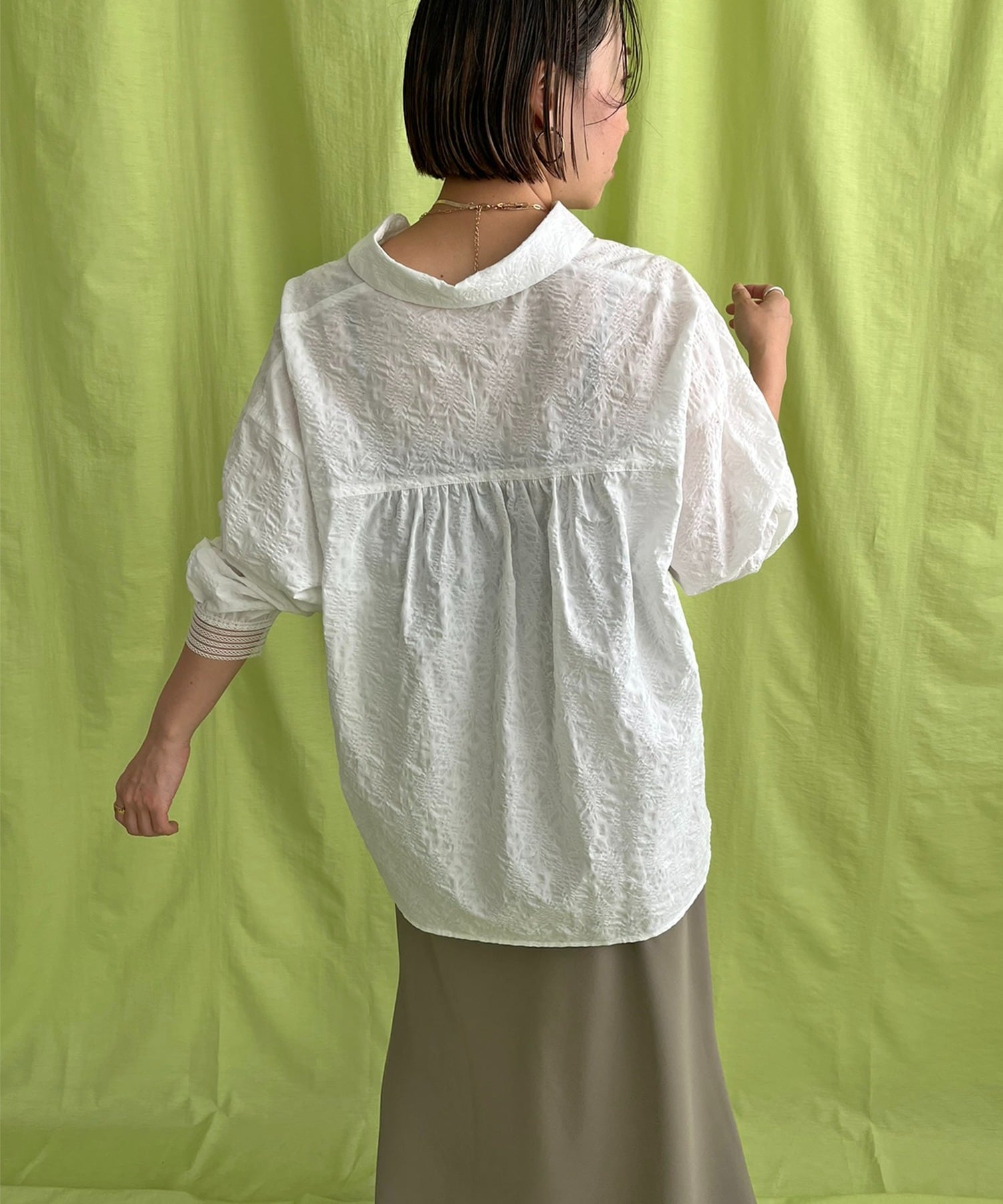 首回りをスッキリと見せるスキッパーカラーと、ルーズなシルエットが抜け感を演出してくれます。