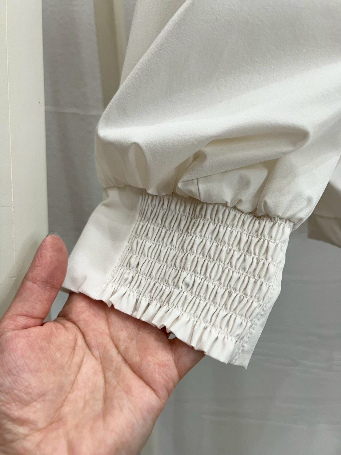 袖口はシャーリングゴム仕様で、たくし上げたときに自然とニュアンスが出てこなれた印象に仕上がります。