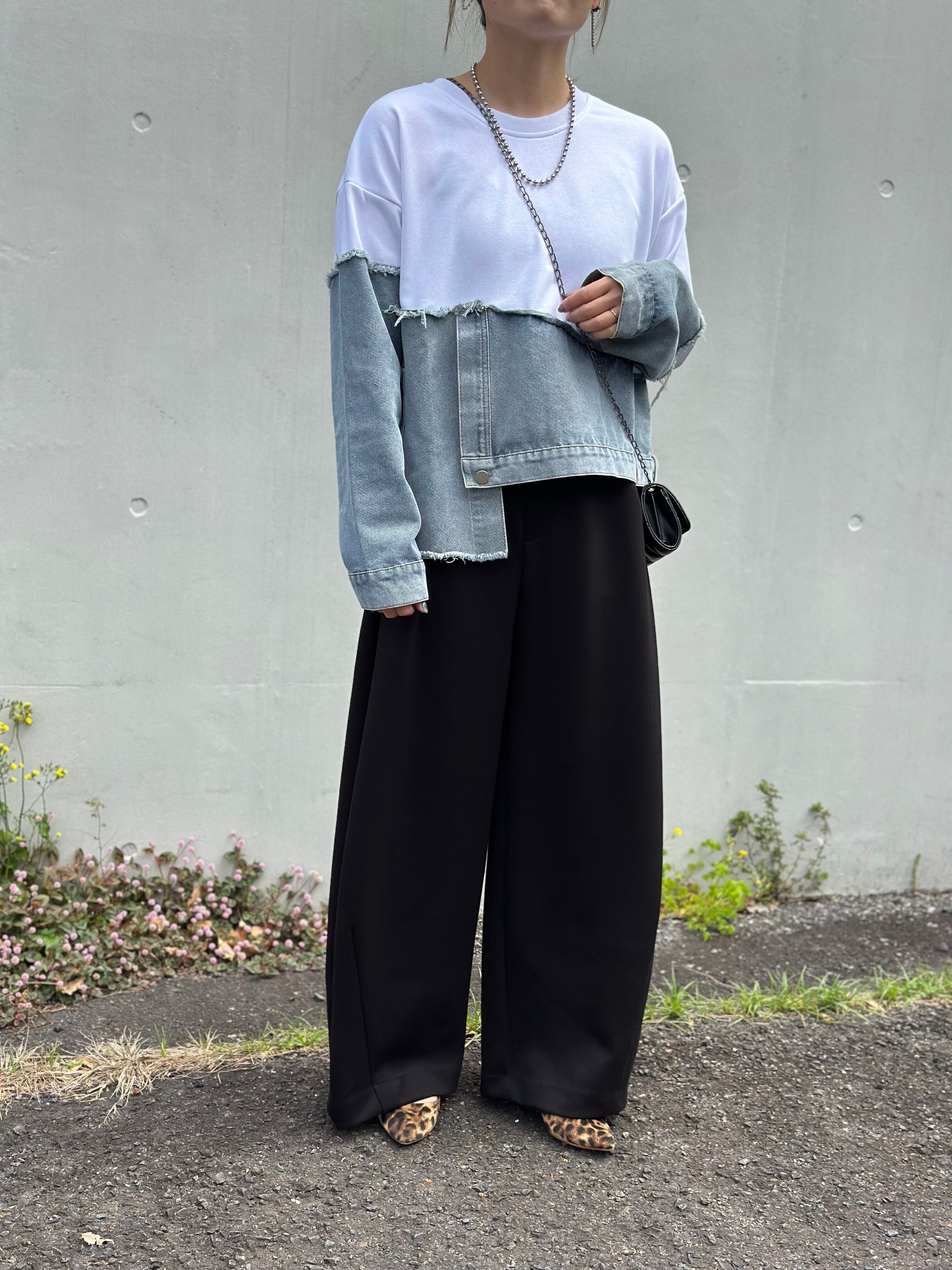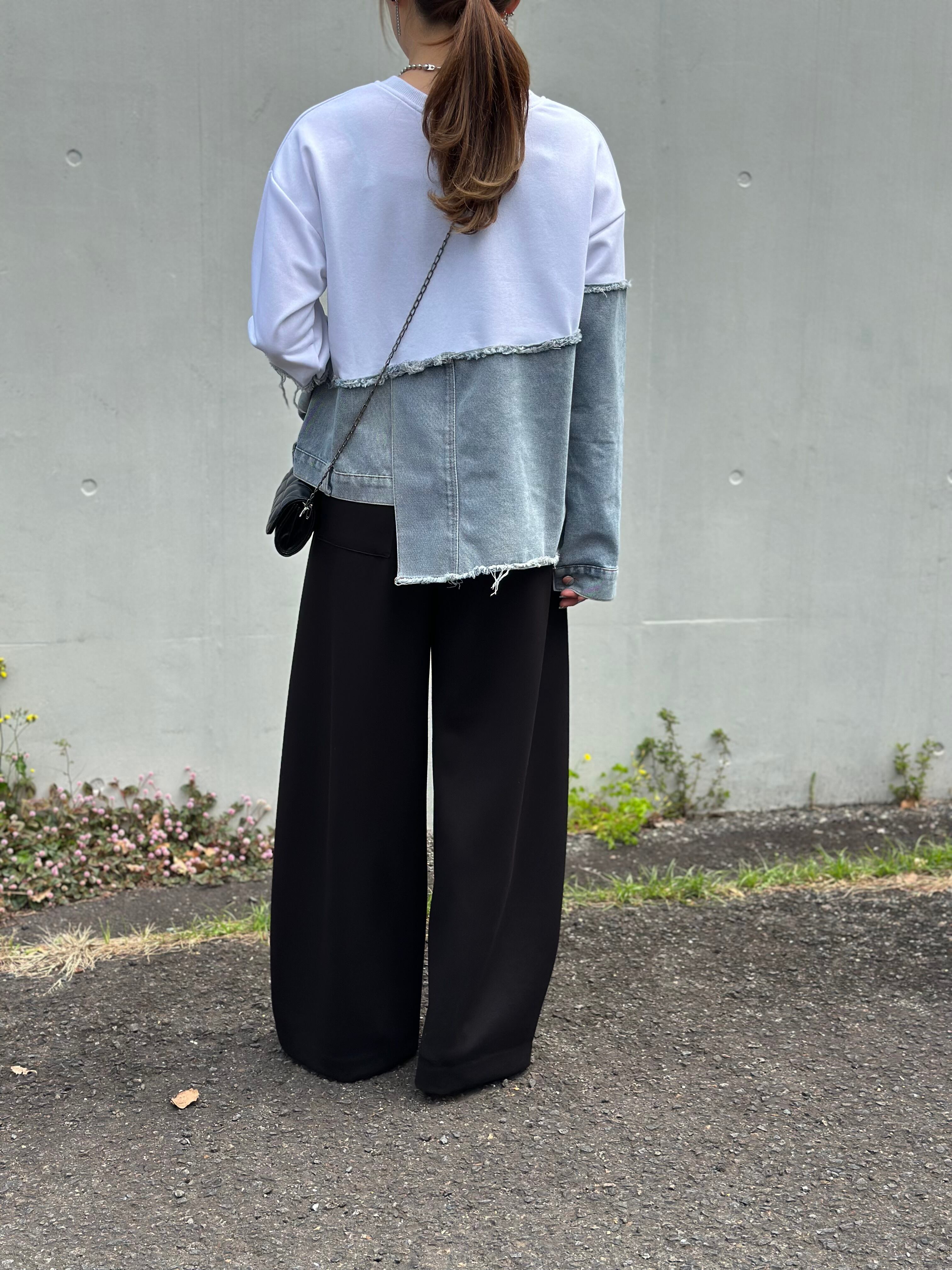 薄手の柔らかスウェットにデニムをドッキングしたデザインtops。