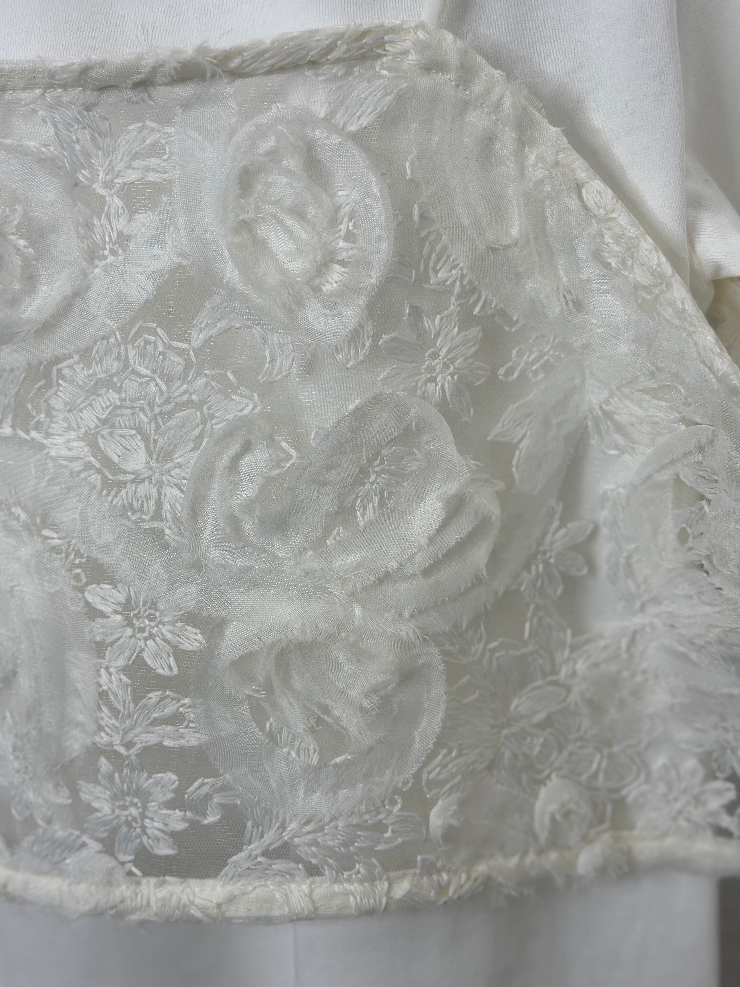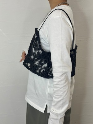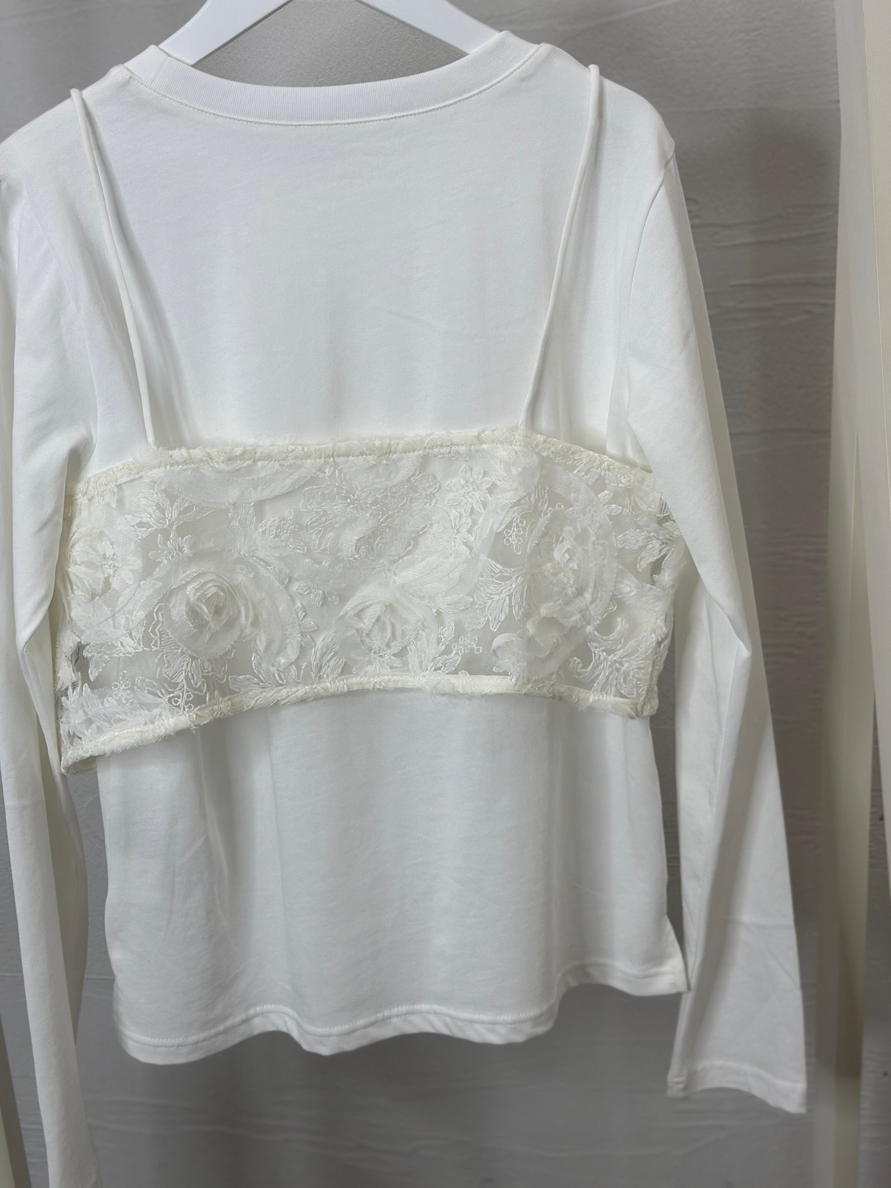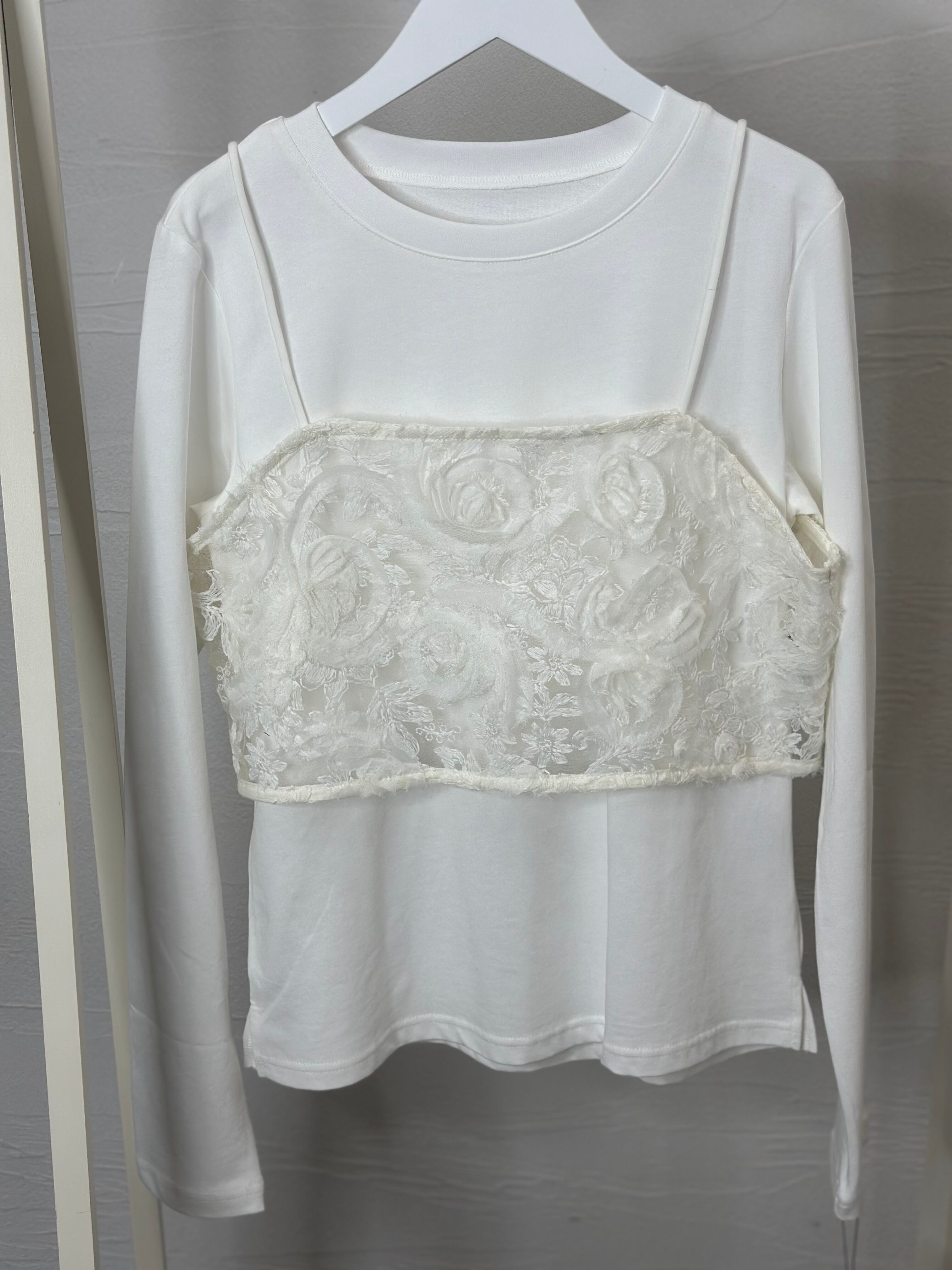 ベーシックなクルーネックロンTとレースビスチェのセットアイテム。